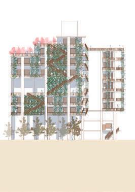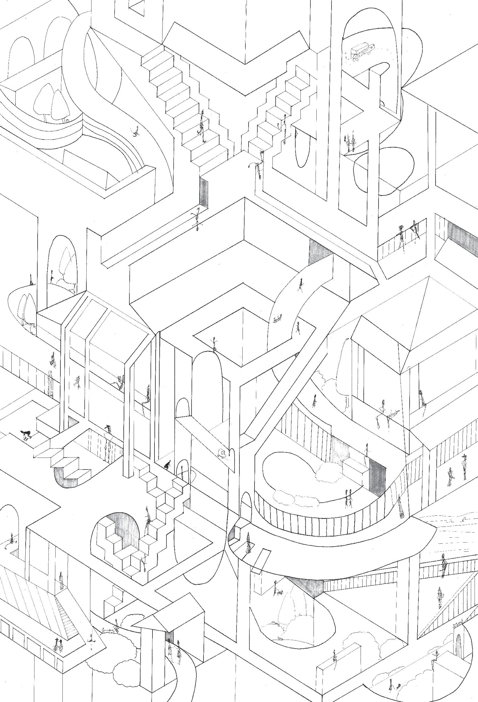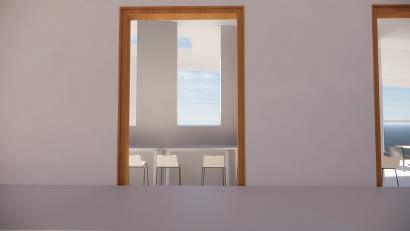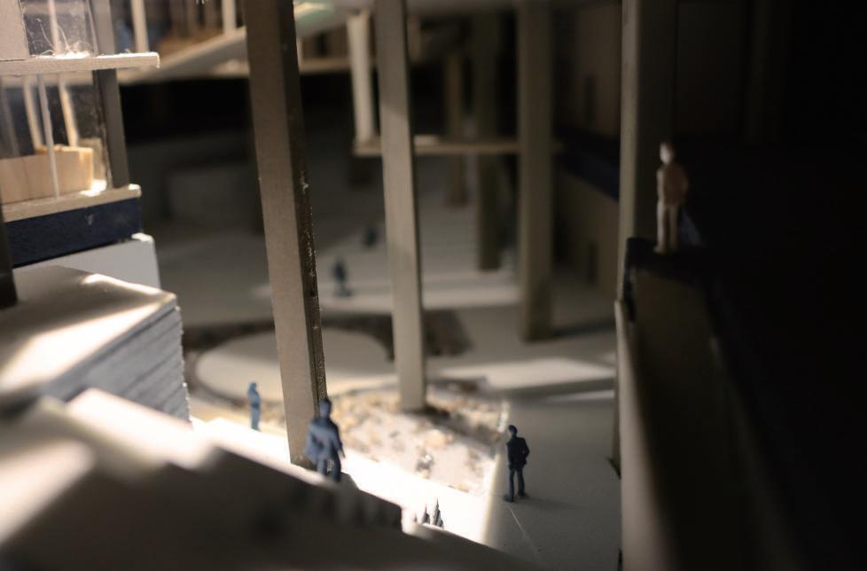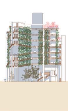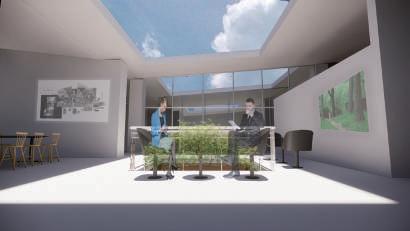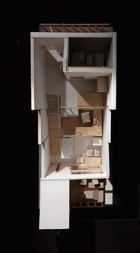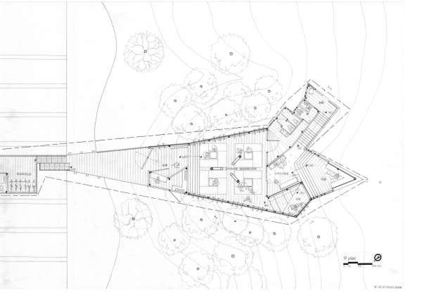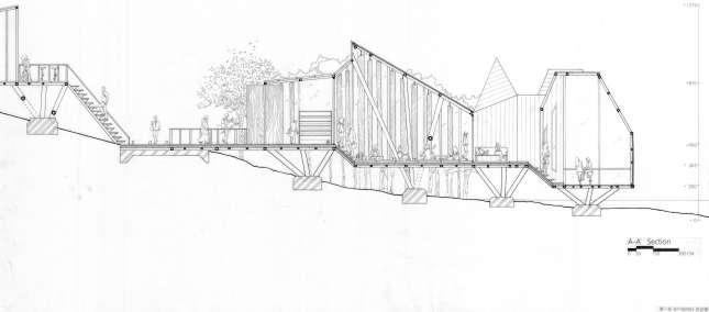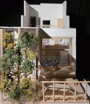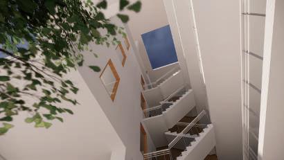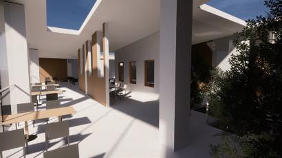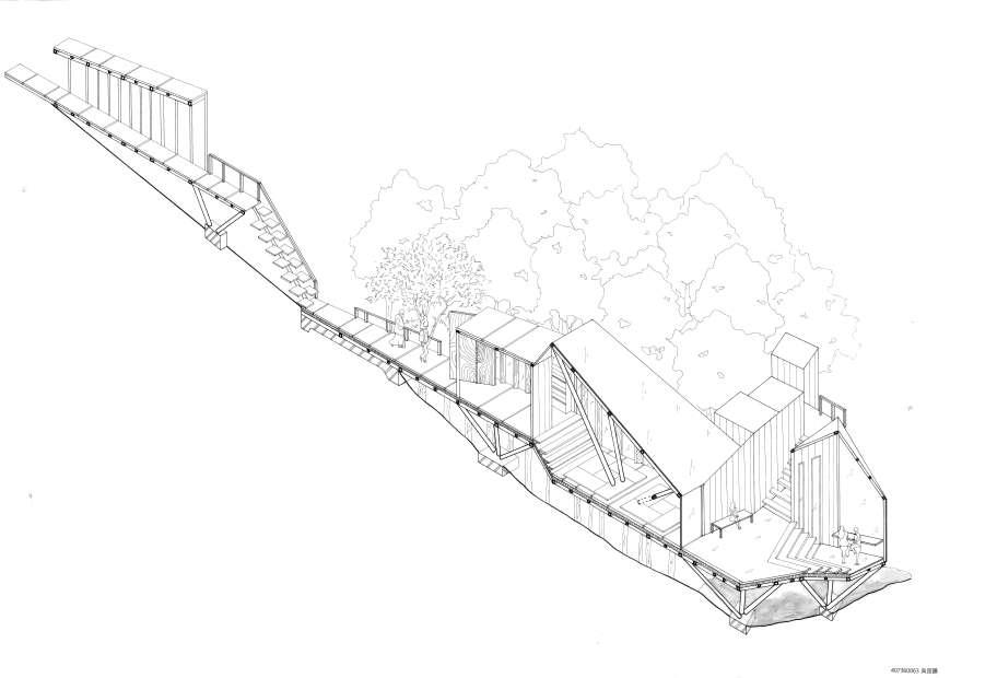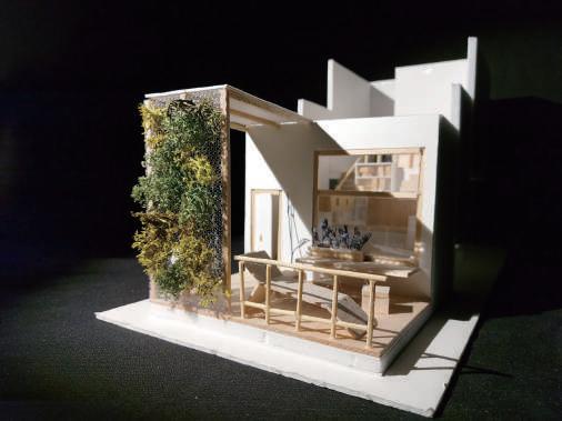 Thr ough change s i n s c al e , r e t re at, f r ame a nd quan tit y , th e pa tio is def o rmed and de ta c h ed f ro m t he o r i g i na l c l o s ed stat e . With w a lls and defo r med p ati o s as th e ma i n de si gn e l emen ts, t he G e st a lt t heo r y w a s u s ed to enc l o s e th e requ i red p h y si ca l s pace . V irt u al s pace is u s ed fo r s oc i a lizi ng and re sti ng .