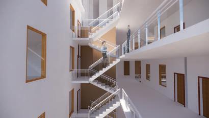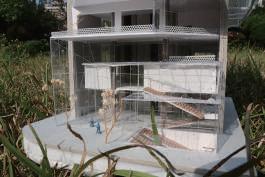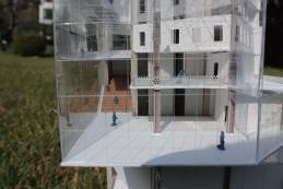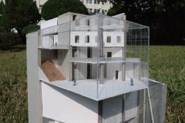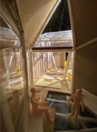 Thr ough t he defo r m atio n of t he four pa ti o s, t he pa ti o s a r e opened t o th e bound a ri e s of t he ba s e , a ll ow i ng t hem t o "c o me ou t of th e r o o m a nd s ee th e ou tsi de wo rl d" . Th e d ir ec tio n of t he slo p i ng ro o f wa s changed fr o m do w nw a rd to upw a rd , o nce aga i n empha sizi ng t h at "women sh ou l d lo o k a t t he ou tsi de w orl d" . I l ea v e th e be st s pace fo r t he pe o p l e w h o w ill st ay i n th e bu il d i ng fo r th e l onge st ti me , th a t is, th e w o r ks p a ce and t he li b rar y , sa y i ng "W o men s h o u l d be ki nd t o th em s e lv e s " a nd "Women s hou l d be i ndependen t " .