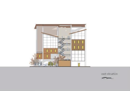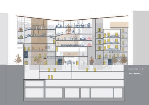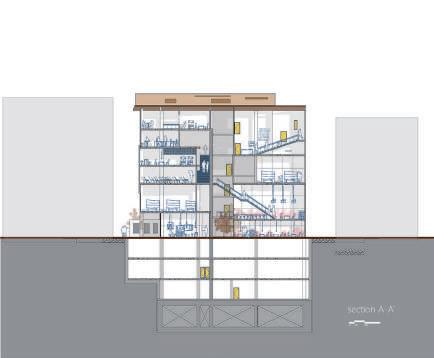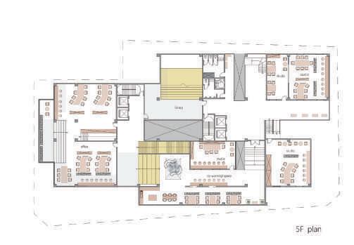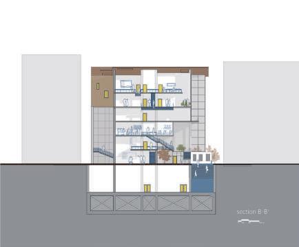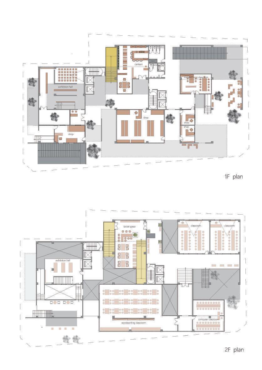 There are multiple entrances that can be accessed from all directions. In addition to the ground floor open to public use, there is a continuous public path that takes you to the library on the fifth floor. Roughly divided into four districts of the site, between two districts is connected by a staircase or a semi-outdoor space. On the top floor, the four districts are integrated and combined with a pitched roof to see it as a whole. Transform elements of historic buildings, place them in new programs, and create a creative center that fits the urban texture of DaDaocheng.
