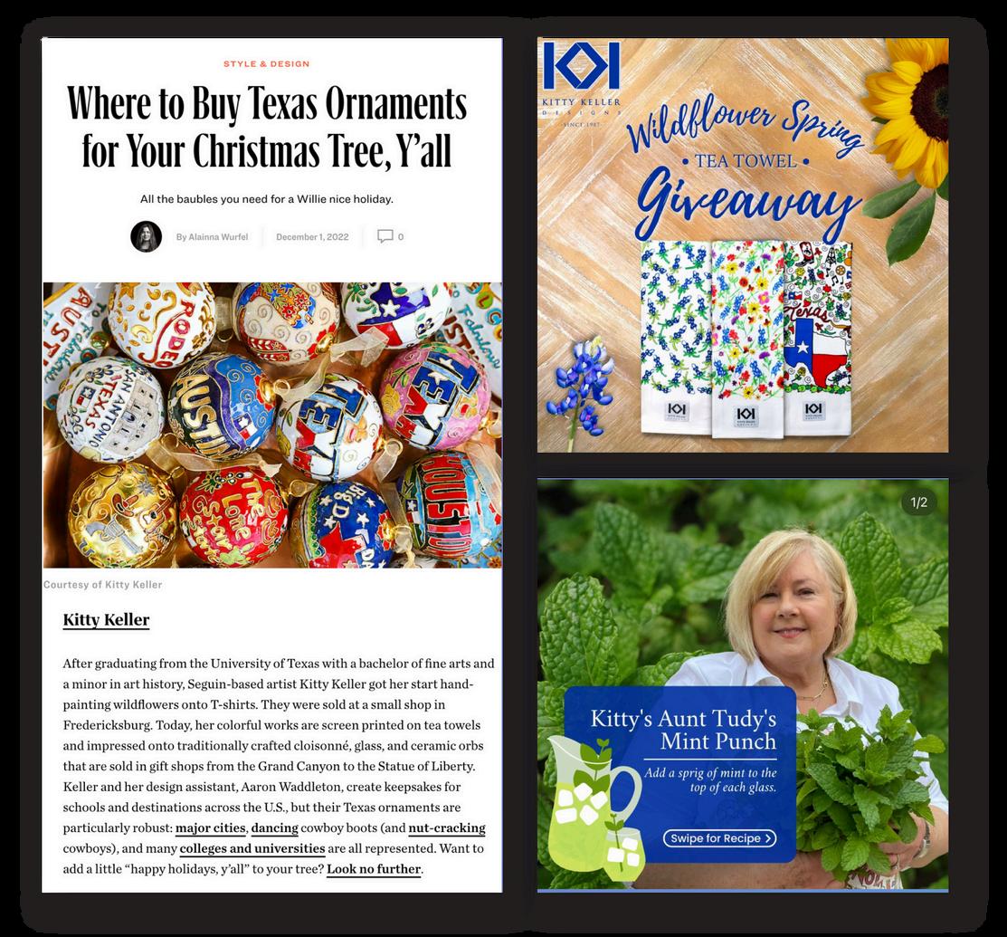Paint-spattered days started it all in 1987 as I hand-painted dozens of T shirts daily with Texas wildflowers. My first customer was called Something Different in Fredericksburg, Texas. My Mother, Betsy and I hand delivered the T shirt order and managed to squeeze in a lovely lady’s lunch at the Peach Tree Restaurant. Leaving just in time to pick up our daughters from school, my mother and I returned home to Seguin that day receiving a call that the entire order of shirts had sold out in a few hours, thus starting my hand-painted T shirt business in earnest.Four years and so much paint flinging later, I decided to find a silkscreener We still sell our T-shirts, but walking through doors as they opened, I have added Cloisonne and Glass ornaments, custom tea towels, as well as archival giclee prints of my artwork to our offerings