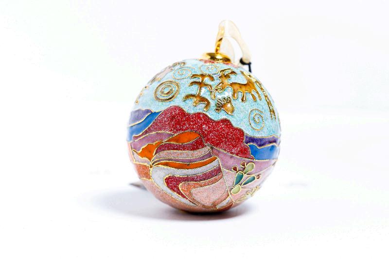Each ornament combines Kitty's artistry with the cloisonné and glass artisan's skill, ensuring uniqueness with every creation. Crafted individually, without templates or machinery, these pieces maintain their distinctiveness, guaranteeing that no two orders will ever be exactly the same.