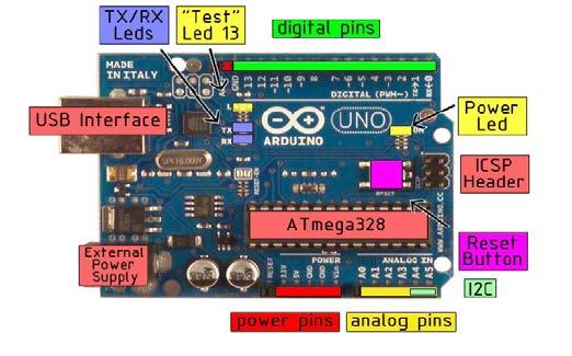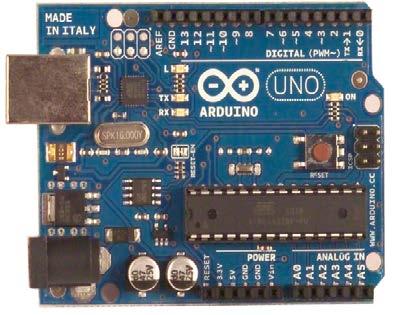 The Arduino Uno is a microcontroller board based on the ATmega328. It has 14 digital input/output pins (of which 6 can be used as PWM outputs), 6 analog inputs, a 16 MHz crystal oscillator, a USB connection, a power jack, an ICSP header, and a reset button. It contains everything needed to support the microcontroller; it simply connects to a computer with a USB cable or can be powered with a AC-to-DC adapter or battery to get it started. It features the Atmega8U2 programmed as a USB-to-serial converter.