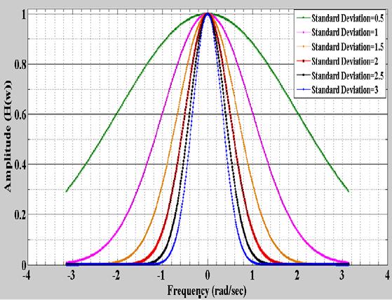 implies that the filter can be truncated at ω =± 3 σ to achieve shorter bandwidth with negligible error. For the region, 3 σ ≤ ω ≤ 3 σ the percentage error is 0.27% and the bandwidth is 24. Other properties of Gaussian filter in the frequency domain are shown in Figure 1. From the figure, it is observed that an increase in standard deviation leads to decrease in bandwidth of the filter. Figure 1 shows that standard deviation of 0.5 gives filter with the widest bandwidth while the standard deviation of 3 gives filter with the narrowest bandwidth. This implies that the bandwidth decreased with increase in standard deviation. On the other hand, smaller standard leads to higher amplitude. However, at the point where ω=0, the amplitude of the filter is independent of the standard deviation. In the time domain, the Gaussian distribution is truncated at ±3σ since the amplitude of Gaussian kernel approaches zero when the execution time becomes more than 3σ. This can be shown in the illustrations in Table4. From Table 4, it is seen that at ���� =±4 σ, the value of h(t) =0.0003 which is very close to zero. At any point when ����≥ ±5 σ, the value of h(t) is zero. This implies that the filter can be truncated at ���� =±3 σ with very negligible error and shorter execution time.