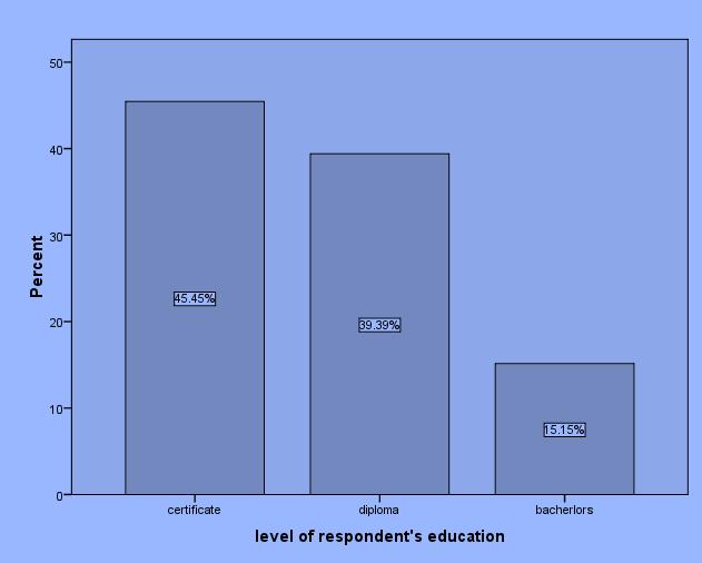 From figure2 above, the majority of the respondents 15 (45.5) are certificate holders, followed by diploma, 13 (39.4%)