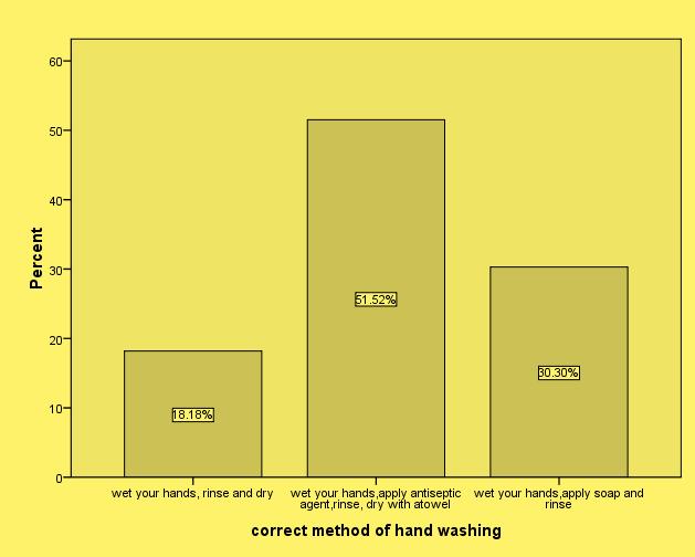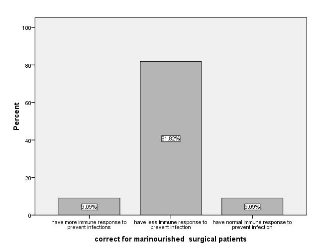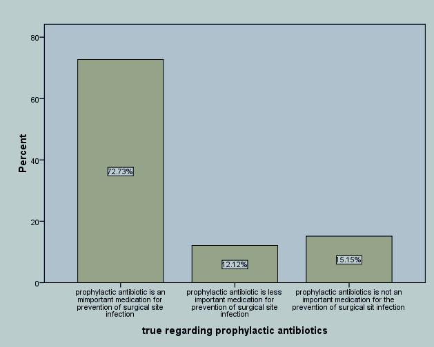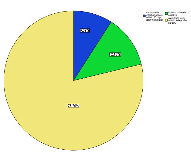 Results from this study indicated that 9(27.3%) knew the recommended method of shaving while 24(72.7%) did not know therecommendedmethodofhairremoval before surgery;13 (39.39%) correctly on the best time pre-operative shaving(immediately before surgery) while 20(60.61%) did not know the recommended time for pre-operative hair removal;15(45.5%) of the respondents said alcohol based solutions are the best for pre-operative skin preparation while18(54.5%) did not know;6(18.1%) of the respondents knew the importance of pre-operative skin preparation while 27(81.82%) did not know;24(72.3%) said thatpreoperative prophylacticantibiotics are important in prevention of SSI. These agree with [22] “40 % to 60% of the SSI would be preventable with properly administered prophylactic pre-operative antibiotics; while 9(27.27%) thought preoperative antibiotics are not important in preventionofSSI;22(66.7%)Knewwhento give prophylactic pre-operative antibiotics, “timing of the antibiotic is considered critical for effective antibiotic prophylaxisis” [23] while 11(33.3%) did not know; 27(81.8%) knew the importance of pre-operative showering while 6(18.2%) did not know; 17(51.5%) knew the correct procedure of hand washing while 16(48.5%) did not know the correct procedure of hand washing; 20(60.6%) knew the importance of wound dressing while 13(39.4%) did not know the importance of wound dressing;20(60.6%) would correctly judge when to change the wound dressings while 13(39.4%)would not;16(48.5%) of the respondents would objectively based on the wound characteristics choose addressing solution while17(51.5%) would not; which agrees with [22] who stated “appropriate dressing materials should be selected according to the wound characteristics” only 3(9.09%) would correctly diagnose SSI while 30(90.9%) would not correctly diagnose SSI. From the above results, an