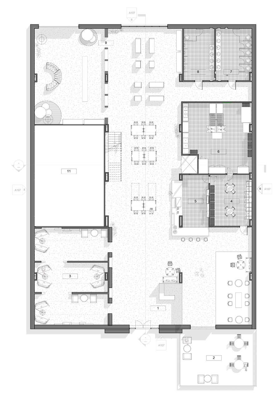 NEST is a creative hub in which coworkers and users share, generate, learn, and create ideas. It is a collaborative space that also allows for semi-private conversations to occur. The design intention behind the applied materials in this space is to create a balance between material, texture, and color to support both public and collaborative work, as well as semi-private conversations. A complimentary color palette was inspired by the NEST logo and informs the seperation and definition of space.