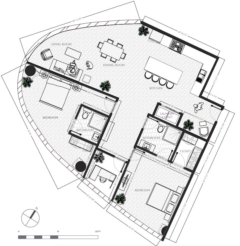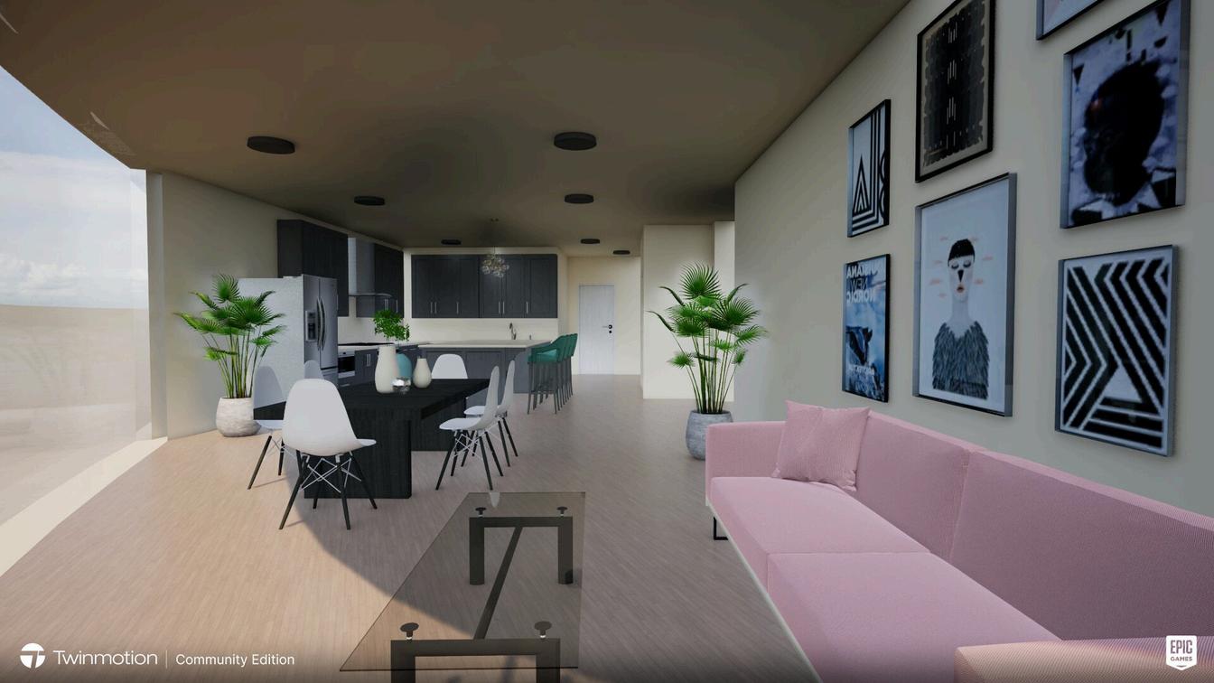 The layout includes a kitchen with an island, a dining room, a living room, an office, a laundry closet, and two bedrooms one with a private bathroom and the other with a shared bathroom. Each bedroom features custom colors and designs, ensuring a personalized space for each sister. The final design achieves a modern, unique, and glamorous apartment.