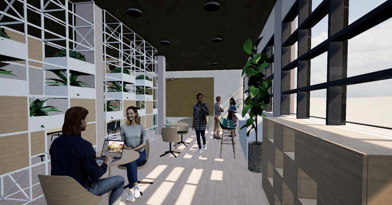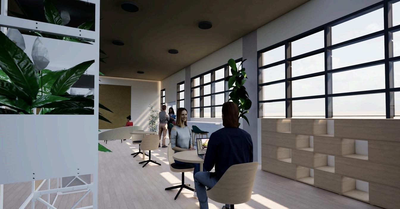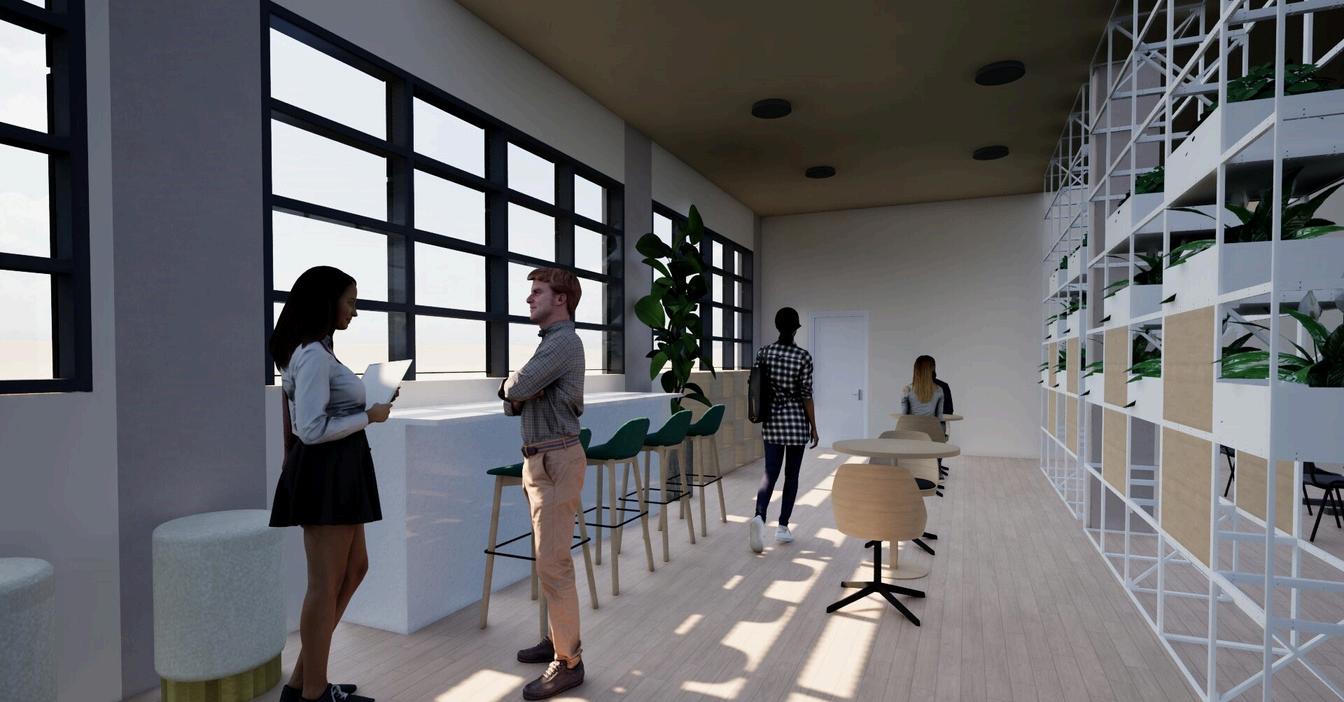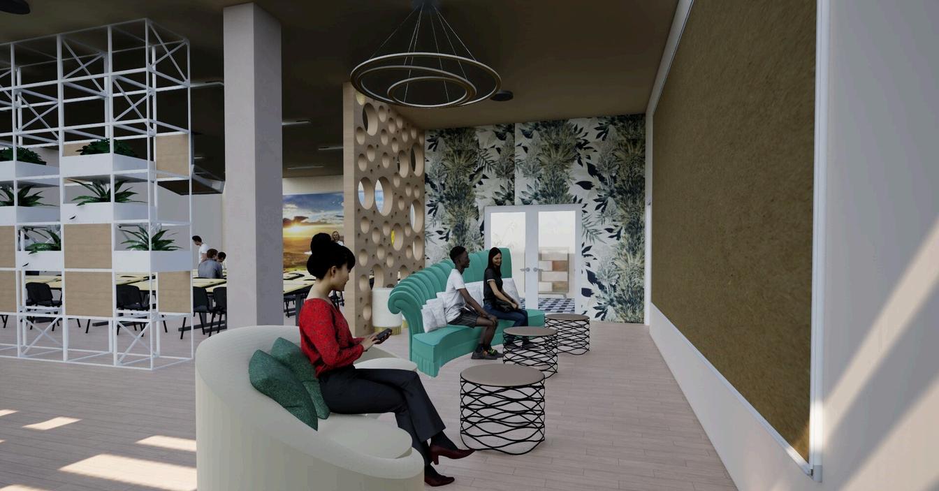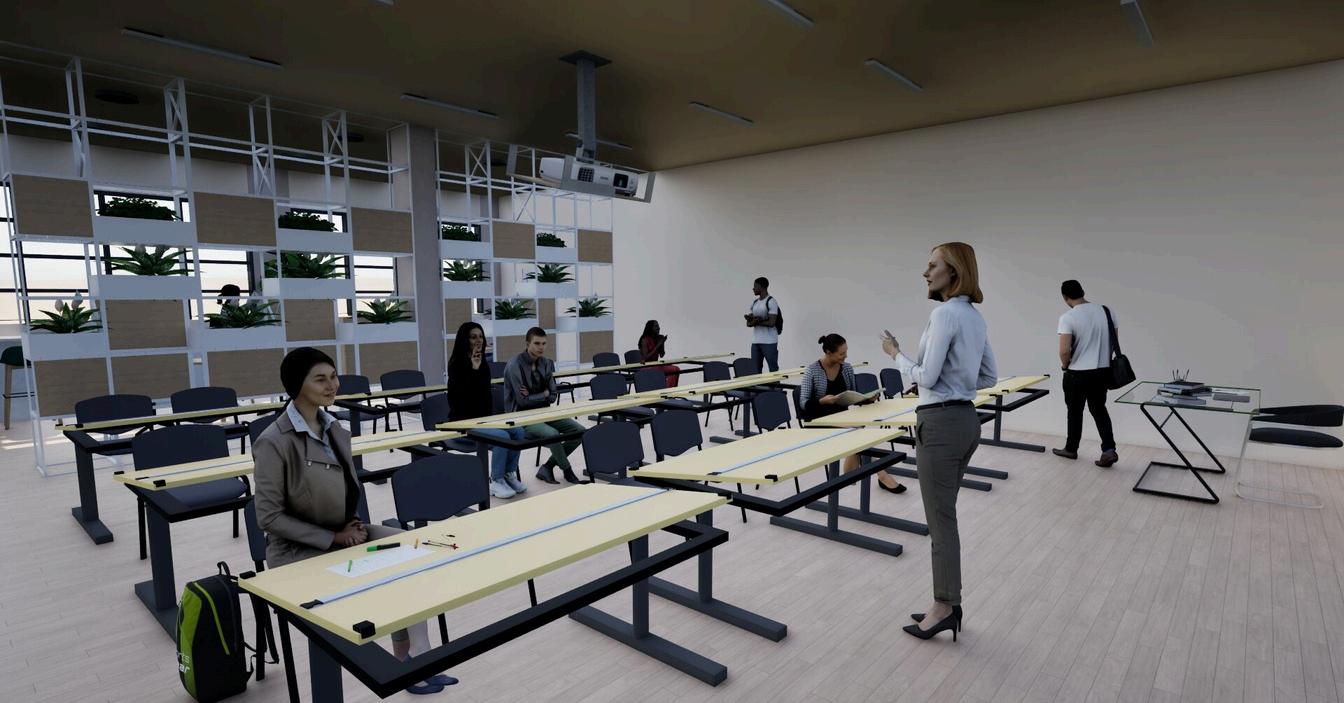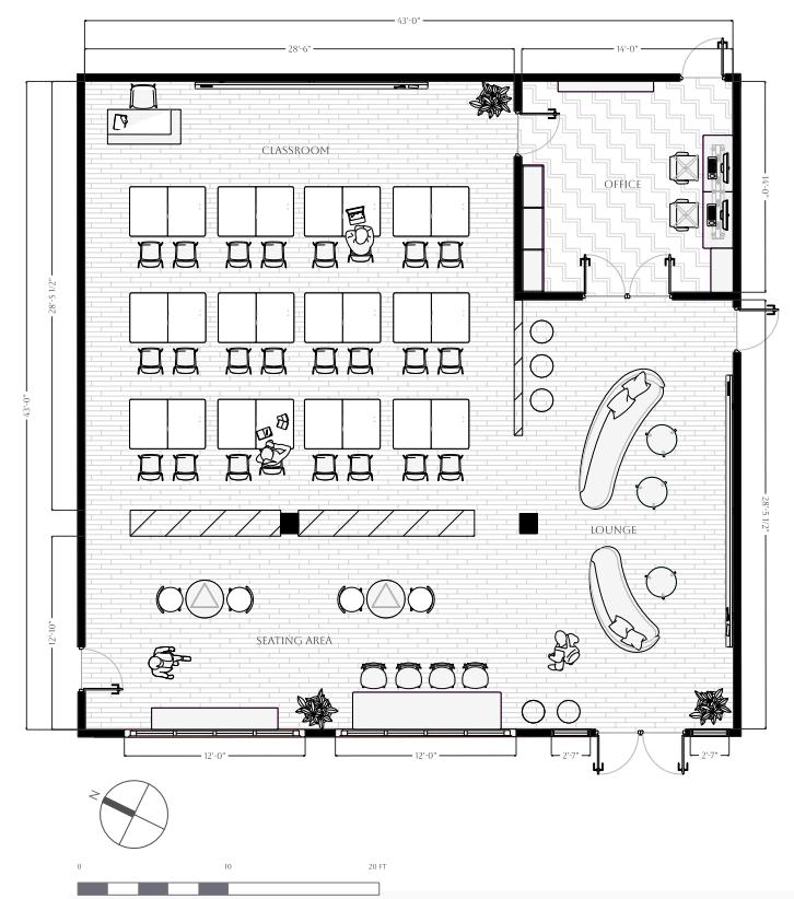 The layout was thoughtfully designed to feature distinct areas: a main classroom, a seating area, a presentation lounge, and a small office that doubles as a storage room. This arrangement creates welldefined spaces for various activities, ensuring a more organized classroom and enhancing the overall student experience.