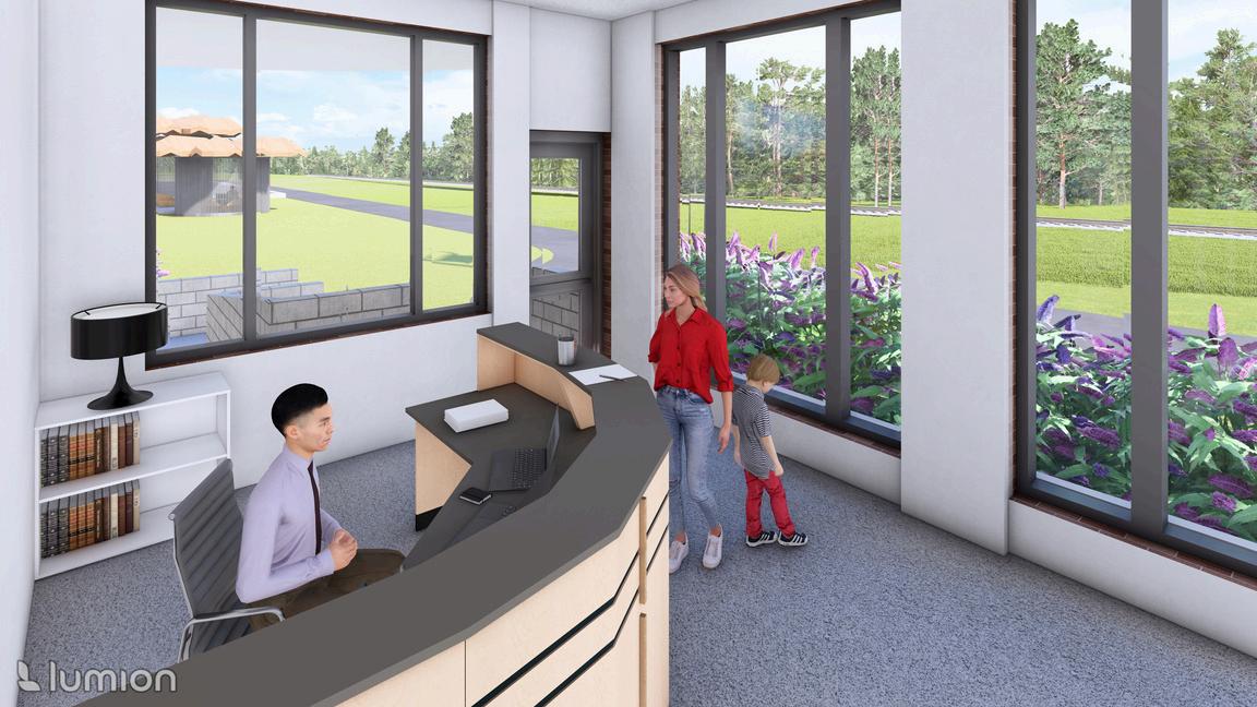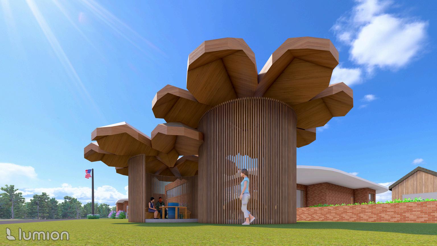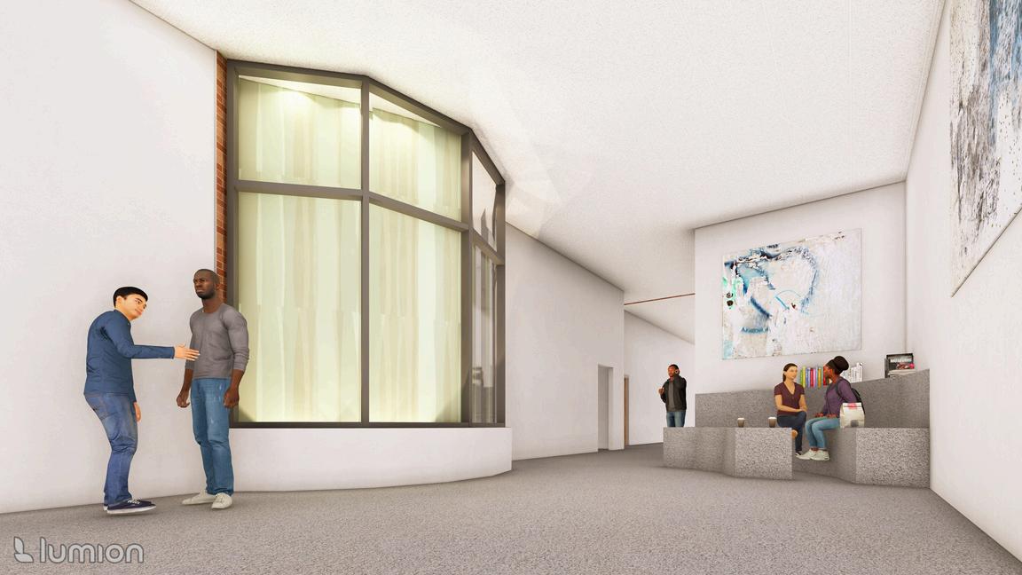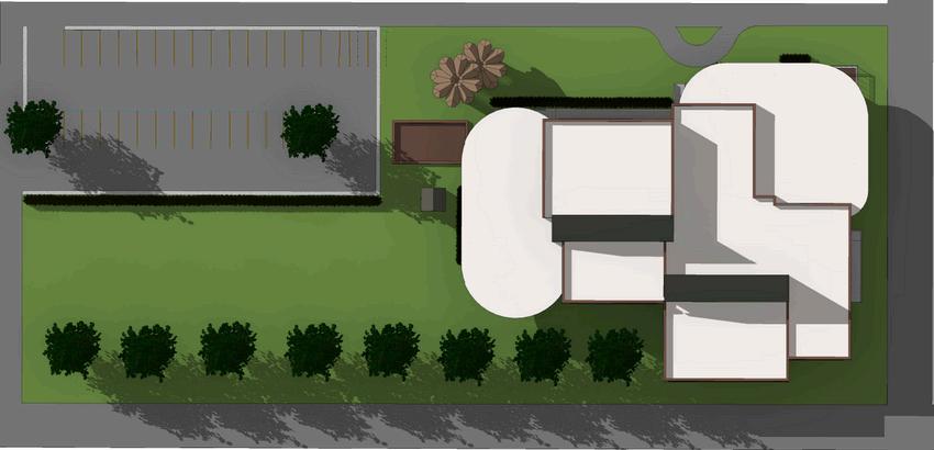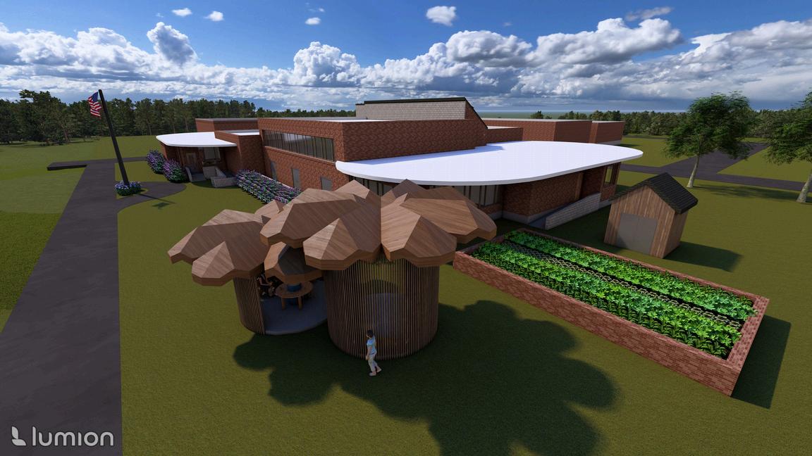 THIS COMMUNITY HUB FOSTERS A DYNAMIC INTERPLAY BETWEEN CURVED AND RECTILINEAR FORMS, WHERE THE FLUIDITY OF THE CURVED ELEMENTS CREATES INVITING GATHERING SPACES, WHILE THE RECTILINEAR COMPONENTS FUNCTION AS “CONSTANTS” THAT HELP DELINEATE THESE AREAS. THE DESIGN INCORPORATES CIRCULAR SPACES THAT ENCOURAGE USERS TO PAUSE AND ENGAGE. FOR EXAMPLE, INTEGRATED SEATING AT THE INTERSECTION OF HALLWAYS OFFERS A COMFORTABLE SPOT FOR RELAXATION, DINING, CONVERSATION, AND MORE. CURVED LIGHT PANELS FURTHER INVITE INDIVIDUALS TO SETTLE IN AND ENJOY THE VIEW. THE PLAY AREA HAS CURVED WINDOWS TO OPTIMIZE NATURAL LIGHTING FOR CHILDREN TO READ, PLAY, OR CONVERSE WITH PEERS. IT WILL ALSO BE A RETREAT FOR KIDS WHO MISS THEIR PARENTS AS IT OFFERS A SENSE OF SECURITY AND WARMTH. LARGE HALLWAYS PROVIDE SMOOTH CIRCULATION BETWEEN INDIVIDUALS AND GROUPS. EXTERNALLY, SHORTER ROOMS ARE DELINEATED BY CURVED ROOFS. DARK COLORED ROOFING HAS SOLAR PANELS AS TO MAKE IT EASIER TO NOT ONLY REPLACE PANELS IF NECESSARY, BUT ALSO THE ROOFING ITSELF. THE PAVILLION’S CIRCULAR FORMS CREATE A DISTINCTIVE ROOF THAT CAPTURES RAINWATER AND SERVES AS A COMMUNAL SPACE. THERE IS SEAMLESS INTEGRATION BETWEEN THE PAVILLION AND ITS SEATING. ADDITIONALLY, THE ACCESSIBLE RAMPS AND STAIRS ARE INTEGRATED THOUGHTFULLY INTO THE FOUNDATION.
