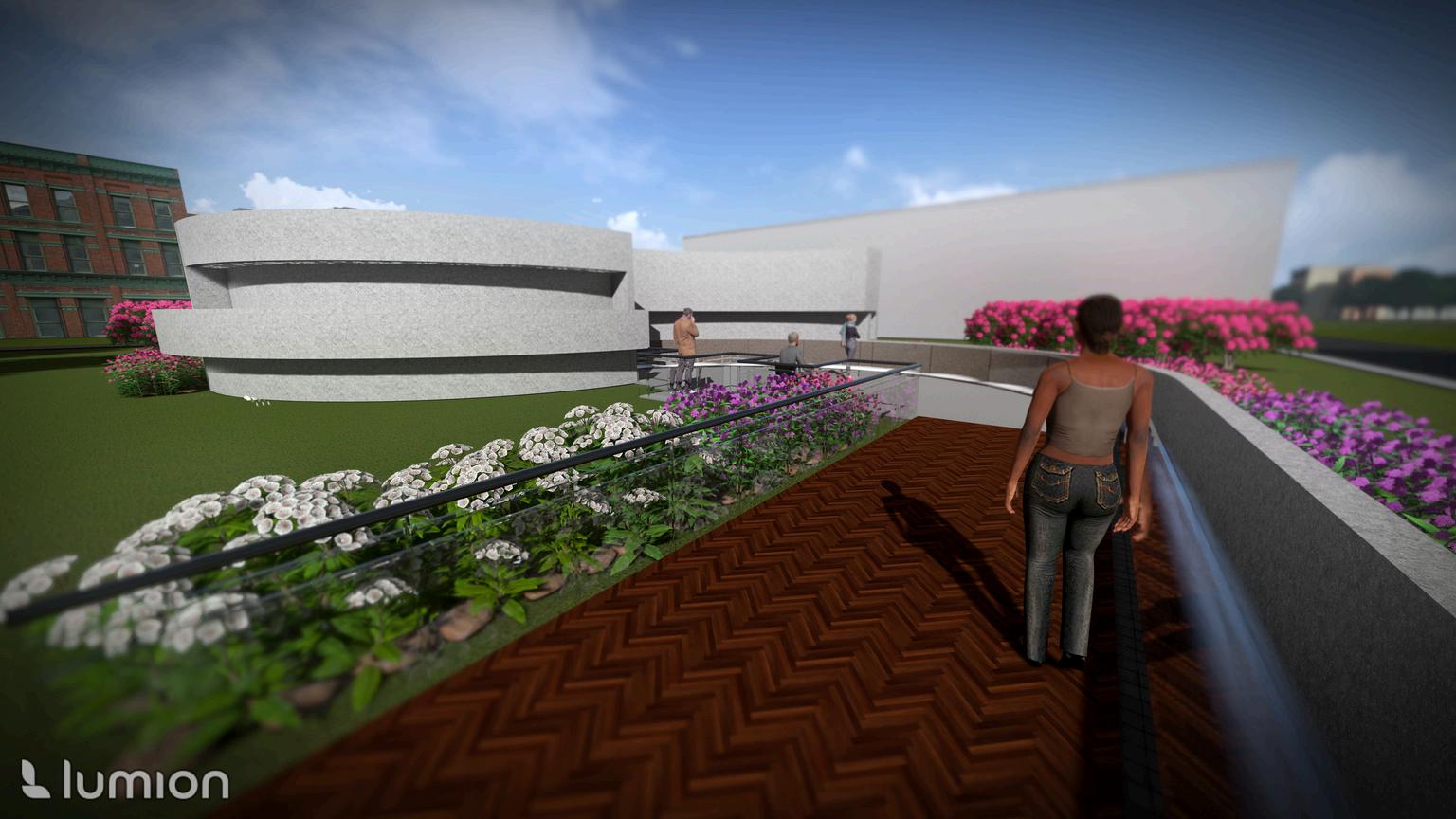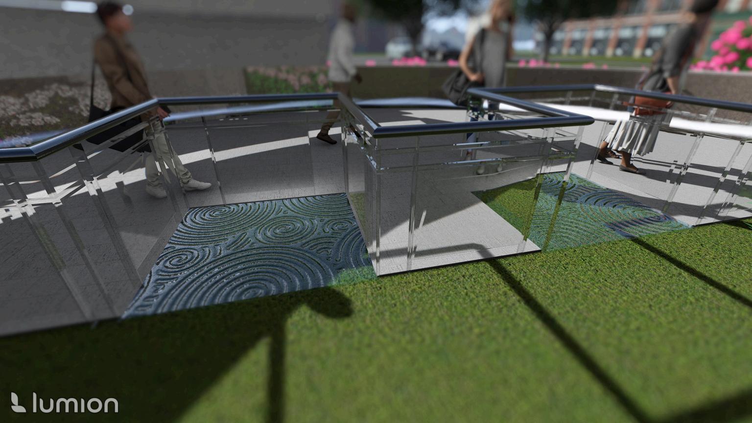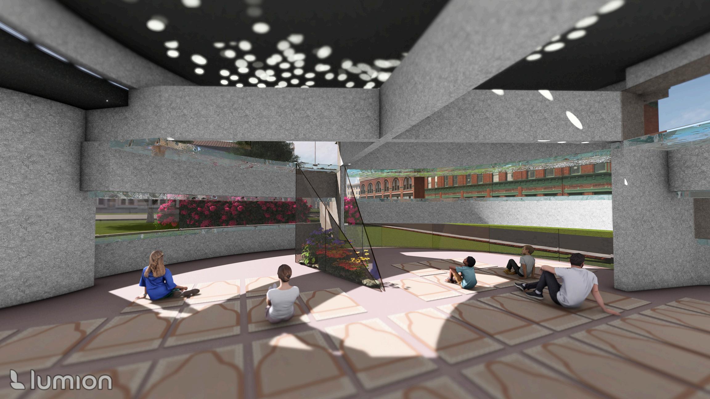 THIS INTERFAITH SPACE USES LIGHT AND WATER TO LEAD ONE THROUGH CONTEMPLATIVE SPACES BEFORE FINALLY ENTERING THE GATHERING SPACE. THE ENTRANCE IS MADE OF BRICK TO REFERENCE THE ORIGINAL BRICK ROADS NOW COVERED IN ASPHALT. THE SOUND AND SIGHT OF WATER FLOWING ALONG THE WALLS GUIDES USERS THROUGH THE WALKWAY. THE PAVED CONCRETE IN THE SHAPE OF TWO HALF CIRCLES BROKEN APART HAVE STEPPED CURVED WALLS THAT HAVE PANELS WITH SHATTERED GLASS TO INCORPORATE THE LAWS OF RELFECTION. THE LAWS OF REFLECTION ARE USED TO REFLECT SUN RAYS INTO THE WALKWAY TO SHOW DIFFERENT DESIGNS OF LIGHT TO FURTHER LEAD THE USER ON THEIR JOURNEY. THE FIRST SET OF CONTEMPLATIVE SPACES ALLOWS FOR ONE TO OCCUPY AND TAKE IN THE SURROUNDINGS. THE OTHER SET CANNOT BE OCCUPIED AS THERE IS WARPED GLASS THAT IS FENCED OFF. ONE IS ENCOURAGED TO ANALYZE THE FEATURES OF GLASS WHEN IT GLISTENS. UPON ENTERING THE STRUCTURE, ONE WILL SEE RESTROOM DOORS THAT LEAD TO A SINK AND ABLUTION FOUNTAIN IN EACH ONE. THESE FEATURES ARE INTEGRATED INTO THE WALLS. ENTERING THE GATHERING SPACE ALLOWS ONE TO FEEL THE WHOLENESS OF A CIRCLE THAT REFERENCES THE HALF CIRCLES FROM THE WALKWAY. THIS SIGNIFIES HOW ONE IS NOT WHOLE BEFORE ENTERING AS THEY HAVE NOT STRENGTHENED THEIR CONNECTION WITH THEIR GOD YET.