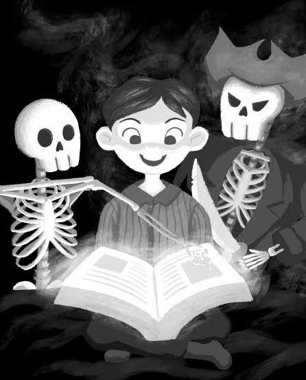 A boy reads Treasure Island with two of the characters from the book appearing from his imagination and following along.