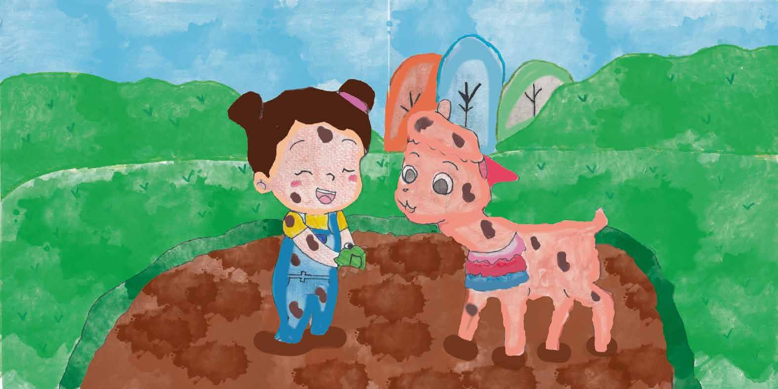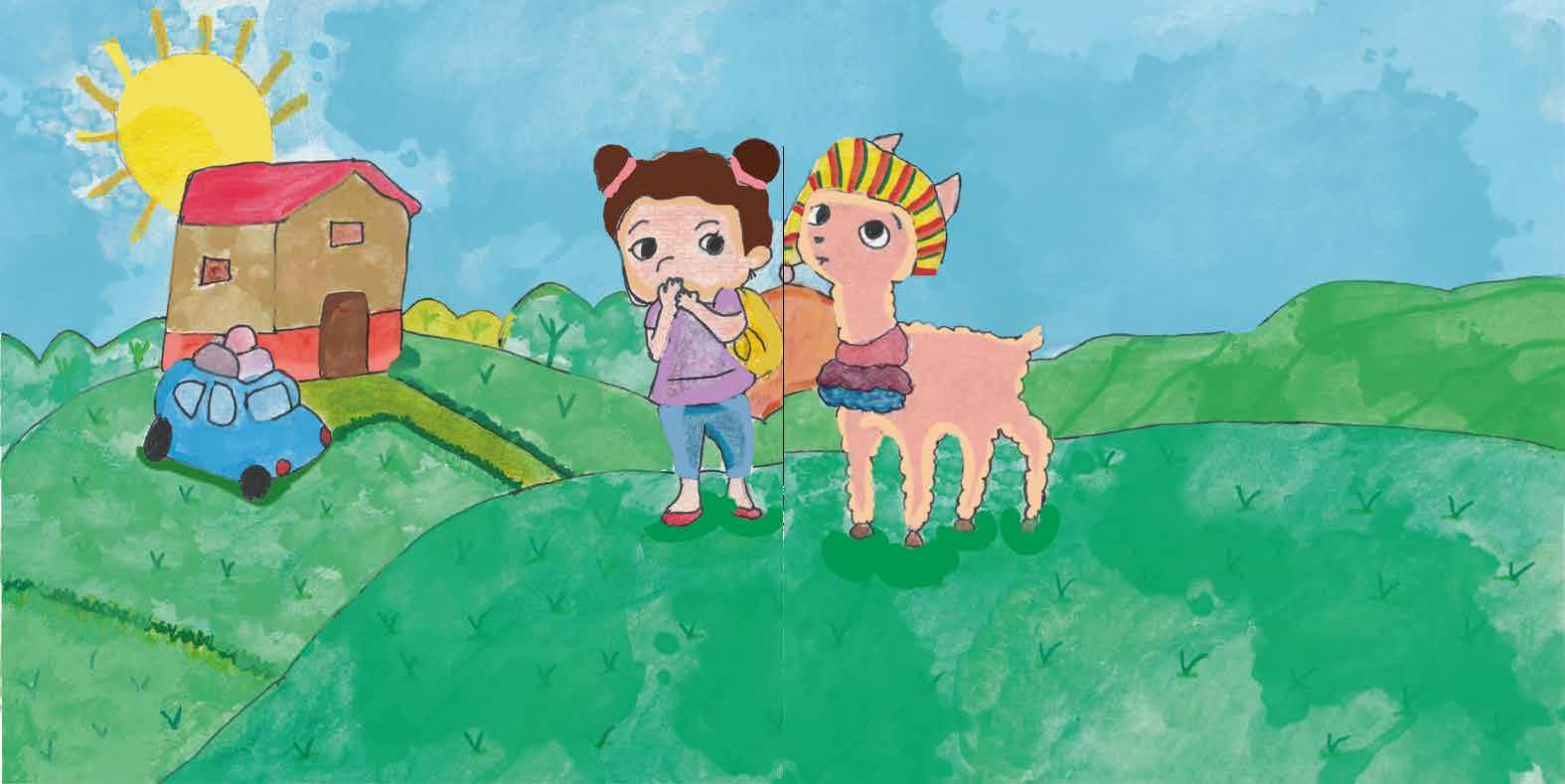 Entonces Haru le pide permiso a su mamá para acompañar a la alpaca y jugar con ella en un charco. De pronto, mientras están en el agua se encuentran con una ranita.