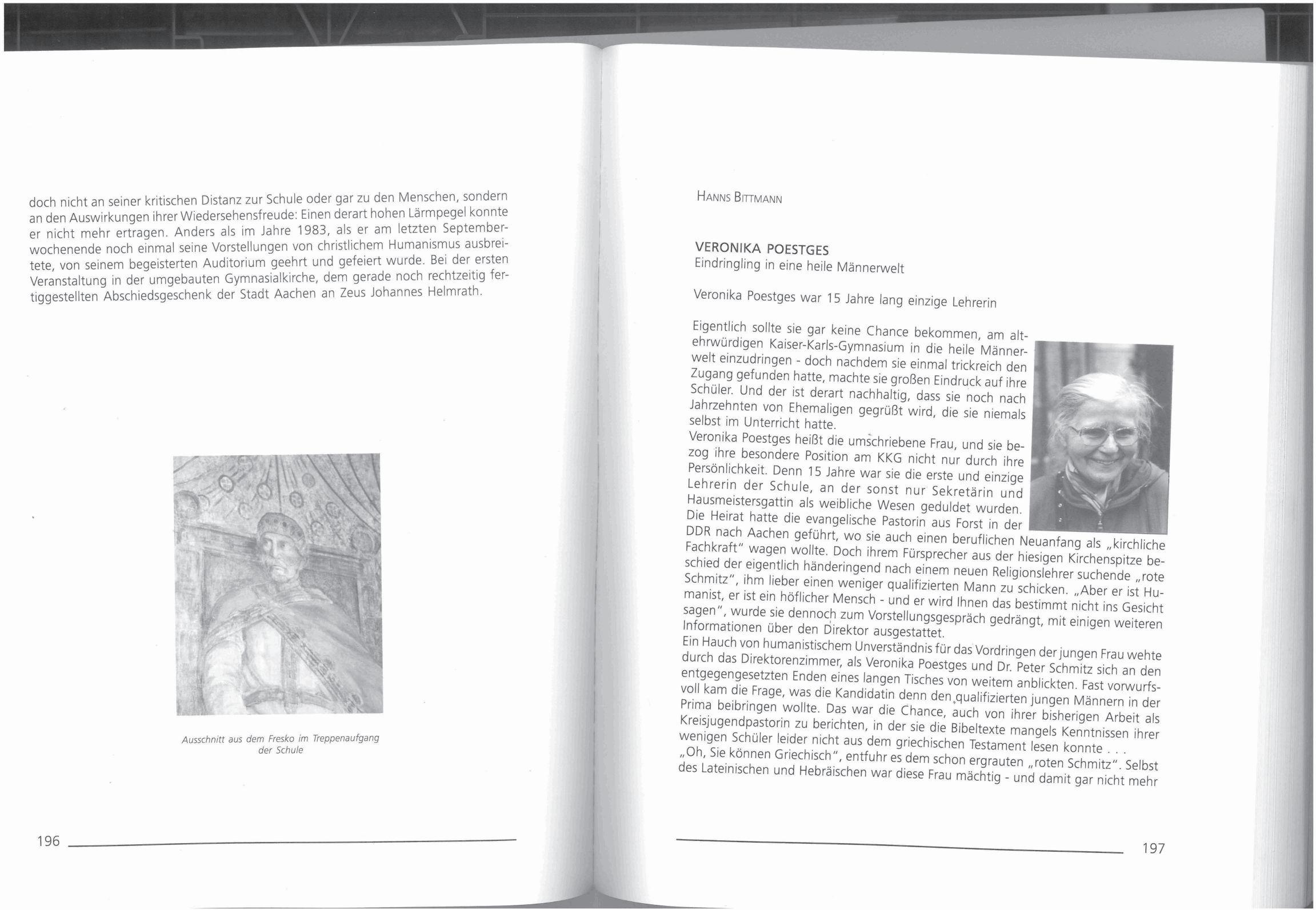 Veronika Poestges, evangelische Religion. Als ganz kleine Gruppe von Evangelischen hatten wir in der Oberstufe nach der regulären Schulzeit Religionsunterricht in einer Rumpelkammer, die sich Schippersche Bibliothek nannte und in der es fatal nach vermoderten Akten roch. Wir saßen um einen Tisch herum und hatten wunderbare Stunden. Wir lernten die Bibel auch textkritisch zu betrachten, weil die Überlieferung aus verschiedenen Epochen stammt.