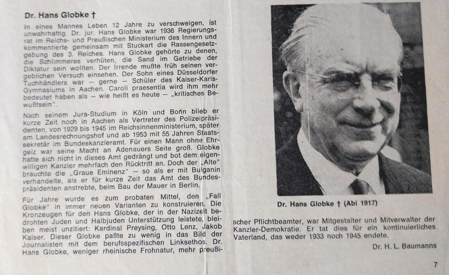 Ein besonderer Fall in diesem Zusammenhang war ein Latein- und Griechischlehrer, der schon als junger Lehrer am KaiserKarls-Gymnasium gewesen war. Im Krieg leitete er eine Boxarbeitsgemeinschaft und es wurde berichtet, das er seine Boxschüler mit den furchtbaren Worten: „Blut muss fließen, Blut muss fließen“ anfeuerte. Viele Klassen hatten unter ihm zu leiden, unsere ganz besonders. Er war ein beschränkter Mensch und behauptete ständig, dass sein Zwergpudel Nina viel klüger sei als all seine Schüler und zitierte immer wieder aus Oswald Spenglers Buch „Der Untergang des Abendlandes“.