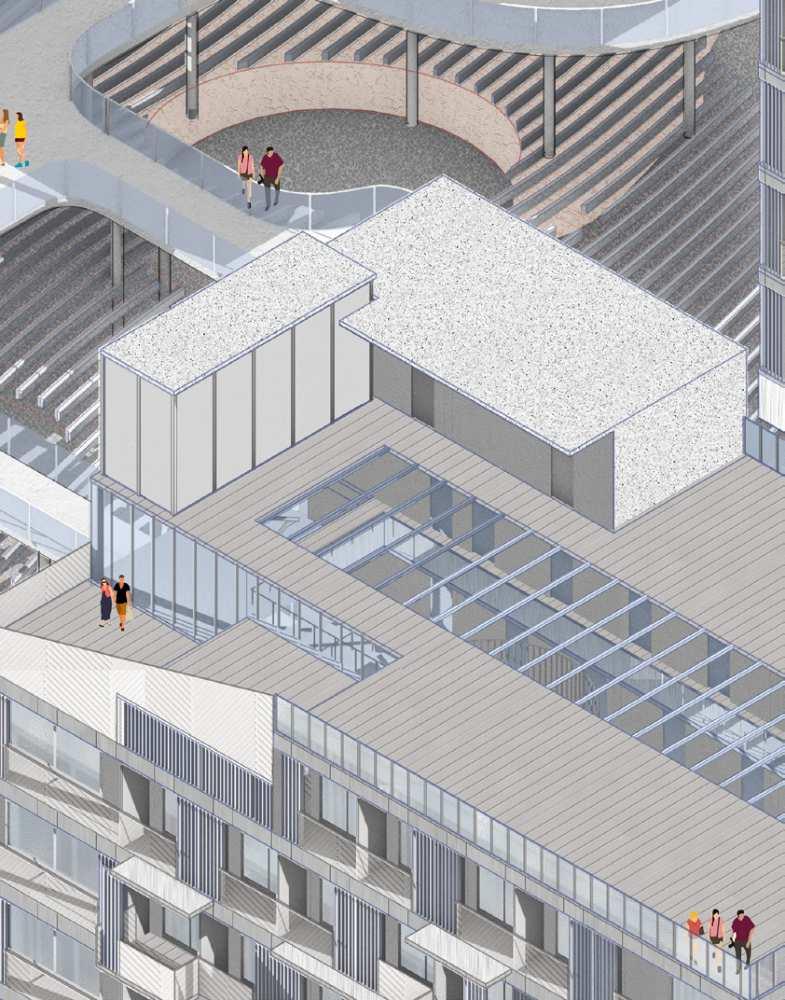 The social space on the roof, among others, covers different functions such as food sharing, community creators, etc.