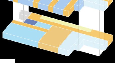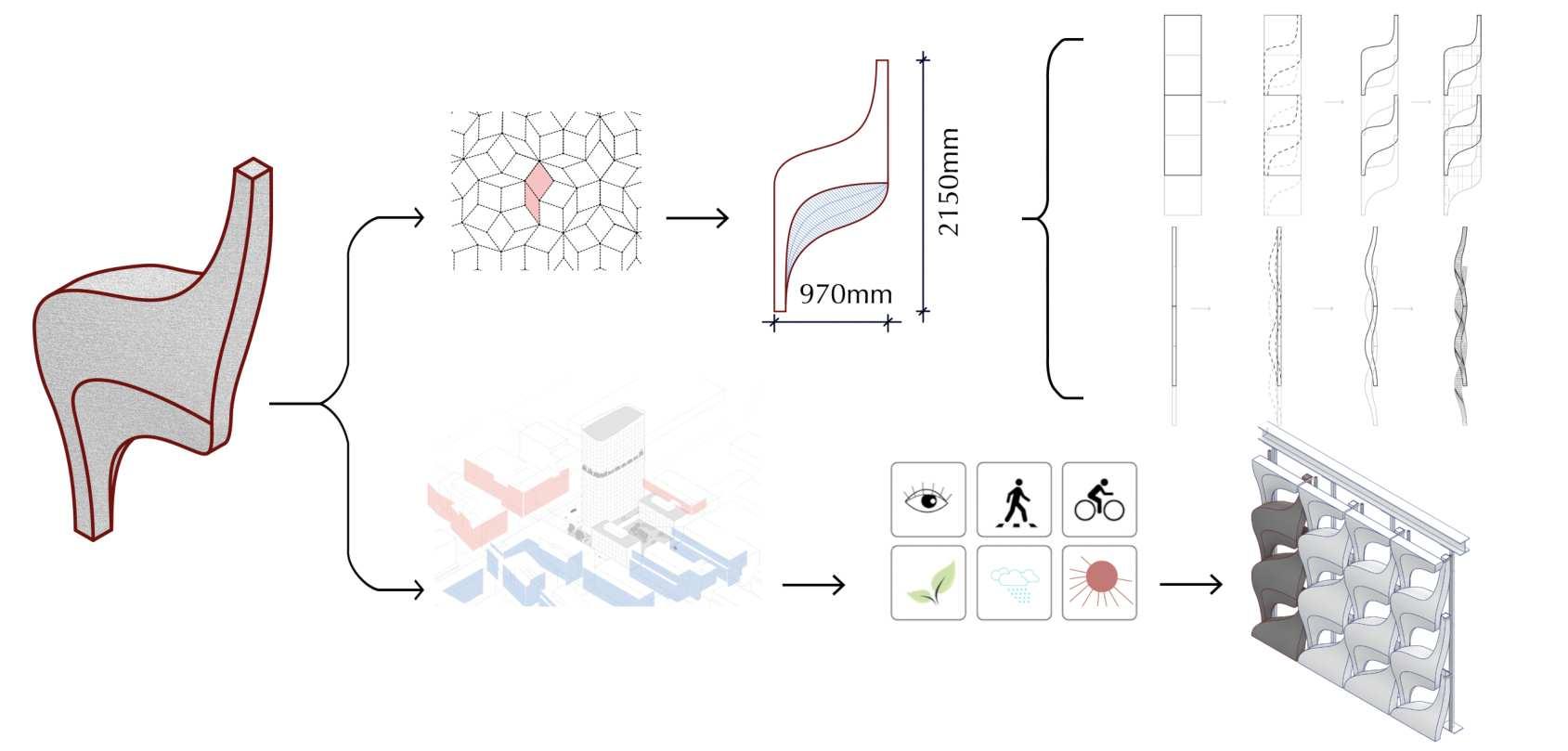Thinking 昀椀rst about furniture and implementing the concept of modularity in furniture and then to the curtain wall, different functional spaces have different needs for enclosing interfaces, for example of昀椀ces need good lighting and the interface needs to be more permeable, while residences need interfaces with better privacy without affecting the lighting, museums preferably have no direct sunlight and interfaces that provide diffuse re昀氀ections. The combination of multiple units allows for a variation in the texture of the curtain wall that is responsive to the functional properties of the internal space and the external environmental elements.