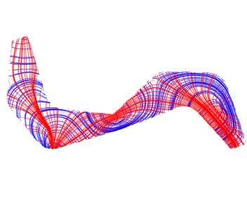 Components interwoven in three dimensions to form repetitive texture and hollowing variations, but differing respectively in the form of the individual components, the direction of spatial interweaving, and the scale of the components.