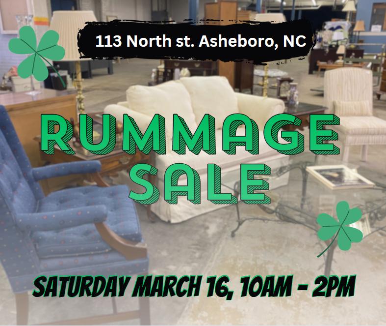 Please mark your calendars for Saturday March 16 for the return of RAG’s Rummage Sale at the historic McCrary Building in downtown Asheboro, NC. Please enter from the rear dock entrance adjacent to the railroad tracks. The Sale has been recently restocked with beautiful furniture, accessories, framed art, collectables, glassware, and vintage silver serving pieces to name a few. Get excited to take advantage of this sale and shop many lovely items.