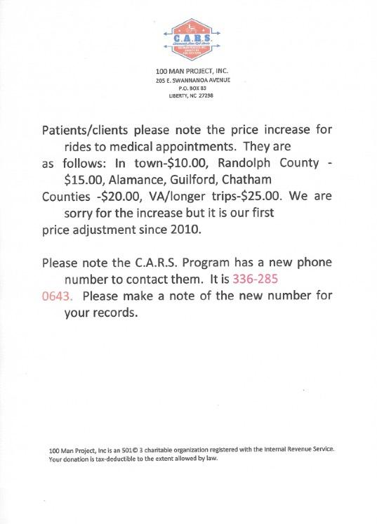 Ph Cell 336-404-9791 Page of 10 32 www.libertynewspaper.org Check Out Our Retail Store And Feed Warehouse A local non-profit organization based in Liberty. We offer transportation for residents of Liberty or Staley or folks that have a 622-Telephone exchange to medical facilities, social services or nursing homes. Call Dispatcher At 336-285-0643 Mon-Fri 8am-5pm COMMUNITY AREA RIDE SERVICE (C.A.R.S.) Community Area Ride Service Ameriprise F inancial Ser vices, Inc Member F INR A and SIPC © 2016 Ameriprise F inancial, Inc Helping generations achieve their dreams. Call me today at 336.610.6200 to get started. Colleen Downey Mitchell, A AM S® F inancial Ad visor RiverRock Wealth Management A mer ip r ise F inancial S er vic es, Inc. 1029 Sunset Ave A sheboro, N C 27203 336.610.6200 colleen mitchell@ ampf com amer ip r isead visor s com/ colleen.mitchell 336-285-0643