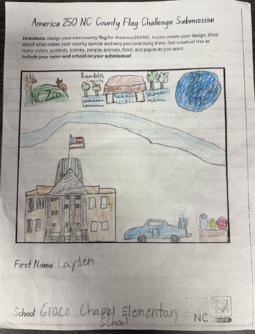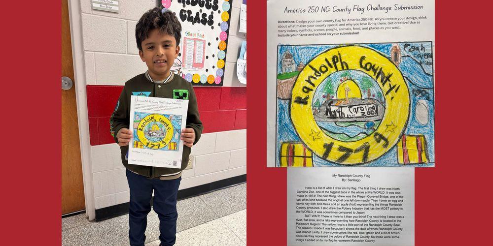 The Randolph County School System participated in the America 250 NC County Flag Challenge, a project commemorating the upcoming 250th anniversary of the United States. The County Flag Challenge is a statewide contest for North Carolina fourth-grade students, initiated by the America 250 NC team to help county committees engage meaningfully with their local communities. The objectives of the project include building awareness of America 250 NC and local county committees; fostering collaborative relationships among America 250 NC, county committees, schools, and families; encouraging critical thinking in fourth-grade students about community, history, geography, and culture through symbolic representation; supporting teachers as they introduce concepts of community identity and America 250 NC ideals; providing a public platform for student voices; and creating a lasting artistic record of this historic moment. Each elementary school in the Randolph County School System selected one student winner. All accompanying essays were submitted to the Central Of leadership selected the top three winners for RCSS. The the Randolph County School System is Santiago from Southmont Elementary School. Second place was awarded to Layden from Grays Chapel Elementary School, and third place was awarded to Brice from Hopewell Elementary School. Congratulations to Santiago for being selected as the winner, and to Layden and Brice for earning runner-up honors. The Randolph County America 250 committee will conduct its own internal voting process to select one overall county winner. The county-winning submitted to America 250 NC, which will feature winners and runners-up through social media, blog posts, and newsletters. Each county winner will also be highlighted on the America 250 NC website. Additionally, the Randolph County committee plans to display all submitted locations throughout the county as we proudly celebrate the 250th birthday of our great nation!