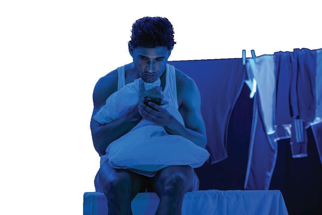One table. Four plates. Three glasses. Two chairs. These are the tangible objects that Abdullah (played by Anzio September) focuses on during one of the most harrowing moments of Zubayr Charles’ Please, Don’t Call Me Moffie. The scene in question, in which Abdullah takes us back to his childhood where he was the victim of both homophobia and molestation by his father, is framed by a potent red light and delivered by an actor who is dedicated to this performance. As he pulls his pants down and thrusts into the table, September’s actions are graphic and deeply uncomfortable to witness.