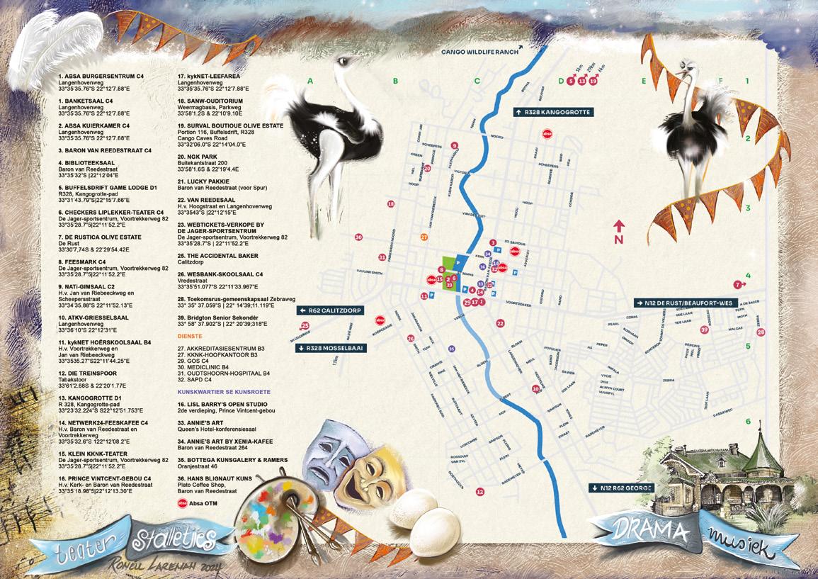 Oudtshoorn is ’n klein dorp, maar maak seker jy het genoeg tyd om van een vertoning na die volgende een te beweeg. Maak gebruik van een van dié sentrale parkeerterreine, wat ook duidelik op die feeskaart aangedui is: Die Oewer en Rolbalklub uit Kerkstraat • Die Checkers-terrein uit Voortrekkerweg en Hoogstraat Die terrein oorkant die Drilsaal uit Kerkstraat • Die Pick n Pay-parkeerterrein uit Voortrekkerweg • Die Meent oorkant die Victoria Memorial Hall in Baron van Reede-straat
