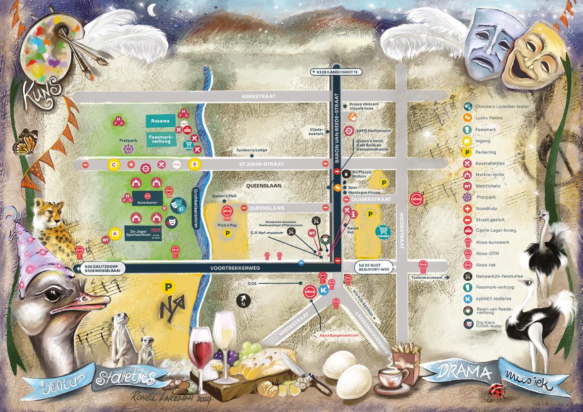 As jy feesnavrae het, besoek die inligtingspunt in die boekwinkel op die hoek van Baron van Reedestraat en Voortrekkerweg, waar ons gereed staan om jou te help. Jy kan ook kaartjies hier koop.
