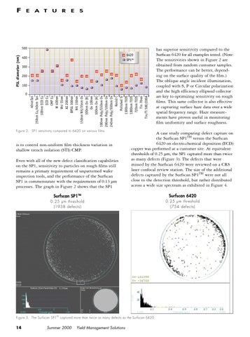 is to control non-uniform film thickness variation in shallow trench isolation (STI) CMP. Even with all of the new defect classification capabilities on the SP1, sensitivity to particles on rough films still remains a primary requirement of unpatterned wafer inspection tools, and the performance of the Surfscan SP1 is commensurate with the requirements of 0.13 µm processes. The graph in Figure 2 shows that the SP1