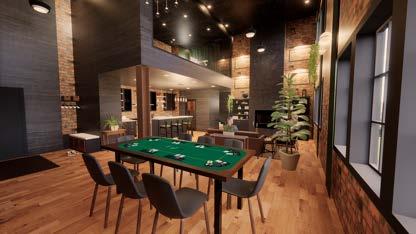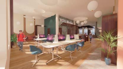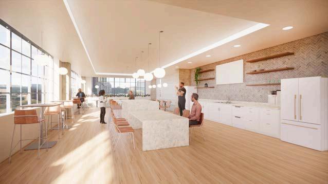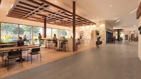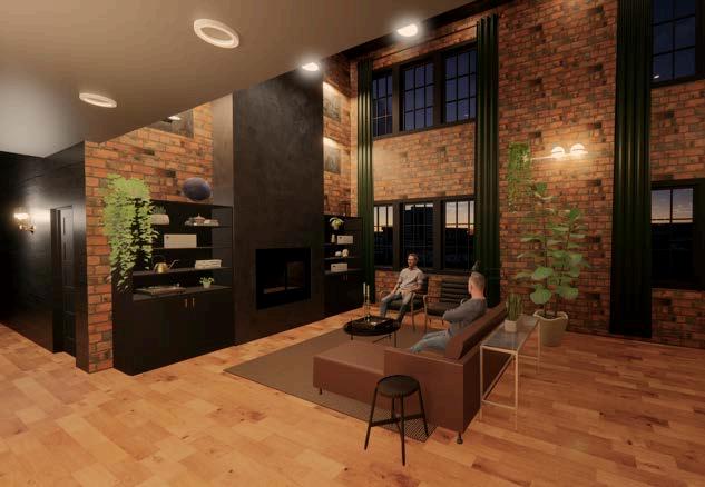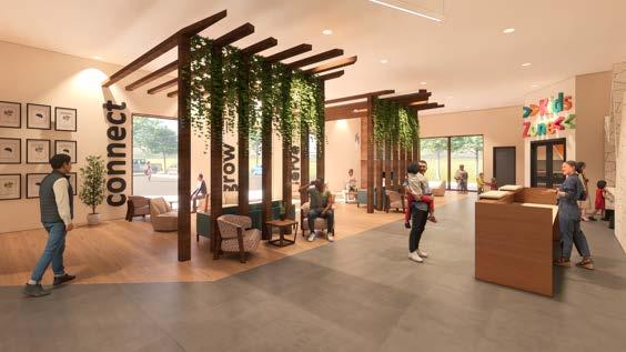 A central café will offer beverages, baked goods, and a nearby lounge area where guests can enjoy their morning. This flexible lounge space will encourage guests to relax by the fireplace after the service, promoting a sense of belonging.