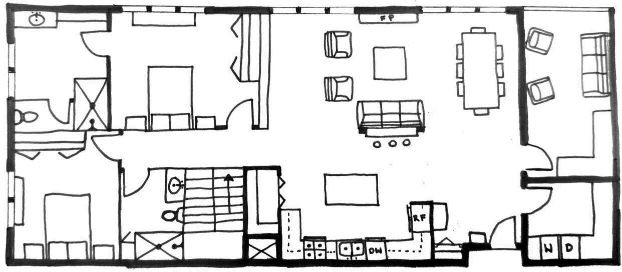 The downtown loft will reflect a cozy industrial design aesthetic, blending various metals, natural wood tones, and earthy elements to foster a warm and cozy atmosphere. The combination of moody lighting and darker features will add a sense of mystery to the space. Exposed brick and linear design elements will enhance the ambiance of the apartment, all contributing to the character of this newly converted commercial space located in Manhattan, New York.