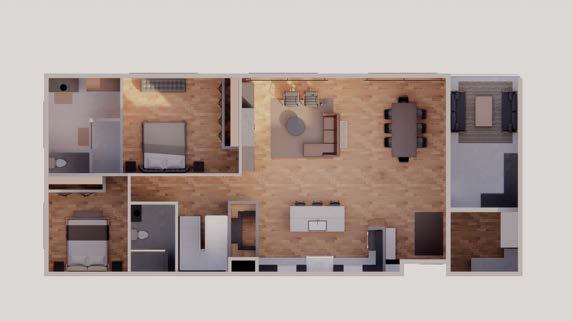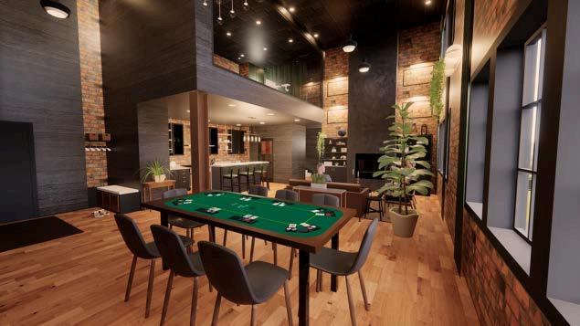 As you enter, the dining table is perfectly arranged for an exciting poker game. The vaulted ceilings enhance the spaciousness of the apartment, while the dark elements and natural materials establish a warm, inviting environment that's ideal for crafting novels and entertaining friends.