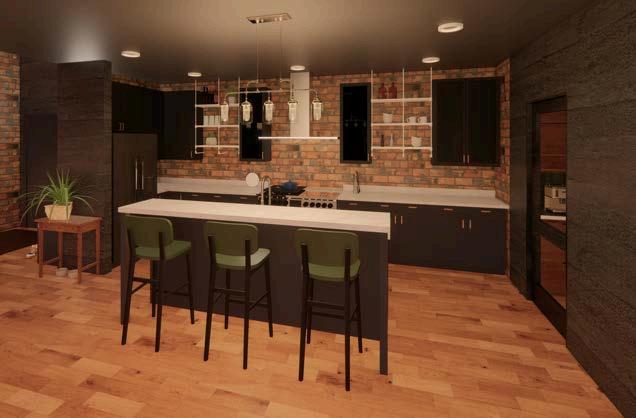 The open-concept kitchen includes an island with barstools, perfect for dining and entertaining. Beautifully arranged shelving showcases an impressive collection of fine liquor and elegant glassware. The dark appliances and cabinetry create a stylishly moody atmosphere, elevating the overall design. Additionally, a walk-in pantry offers ample storage and extra counter space for all your smaller appliances, making this kitchen both functional and striking.