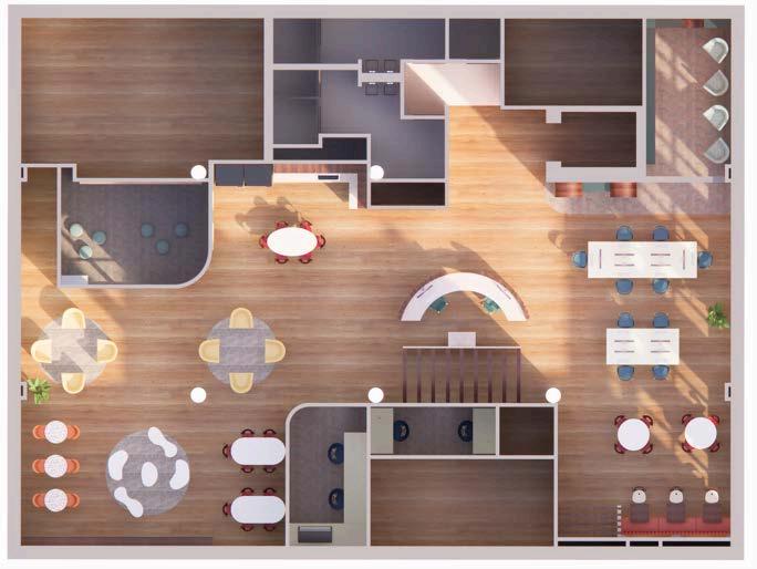Provides more private workspaces for employees. Designated workstations are organized by zone, effectively separating departments to enhance organization and workflow. The resource center is where employees can print documents and prepare for upcoming presentations.
