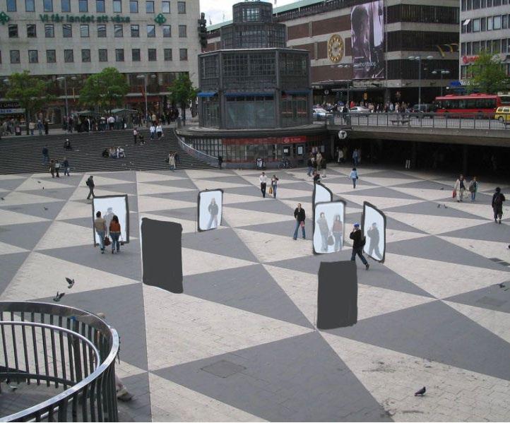 människor mötas på ett säkert sett genom känsel, syn, tal och hörsel. Känseldelen var en skärm med bubbelplast som man behövde vara två på varsin sida av skärmen för att kunna poppa bubblorna. Syn representerades av ett spegelrum utomhus där man kunde sitta på varsin sida om en skulptur och