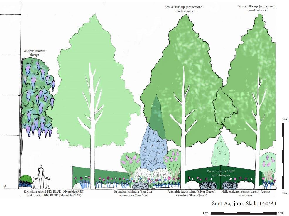 Dessa vyer visar parken inifrån respektive utifrån. Isparken har en solig del i norr och en skuggig del i söder vilket möjligjort variation i växtval. Gestaltningen inkluderar en planteringsplan, lökplanteringsplan samt planer som visar parkens vinterkvaliteter och lökarnas blommning.