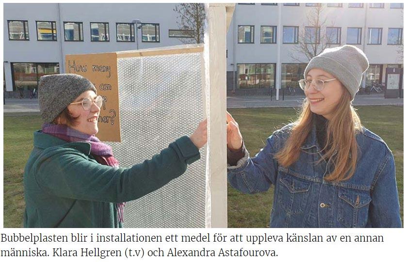 Grupparbete med Alexandra Astafourova, Adriana de Lima Sampaio, Kyung-Jin Cho och Linnea Nyman. Temat för kursen var Covid-19 pandemin och vi valde att skapa en interaktiv konstinstallation på Sergels torg och på SLU campus Ultuna. Pop the isolation hette projektet och handlade om att låta