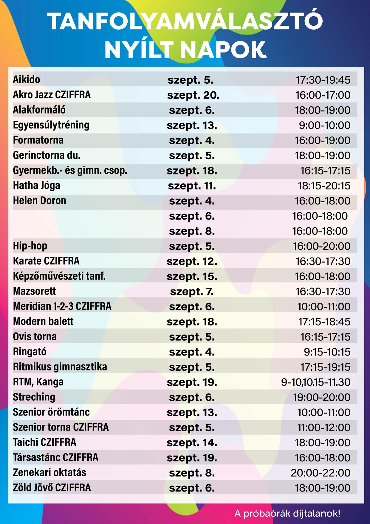 16.00-17.00 (3-6év) 17.00-18.00 (6-8év) Péntek 16.00-17.00 (3-6év) 17.00-18.00 (6-8év)