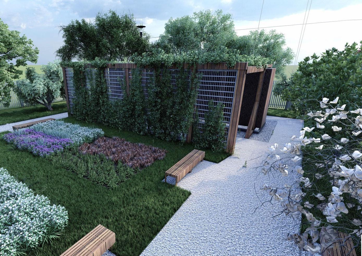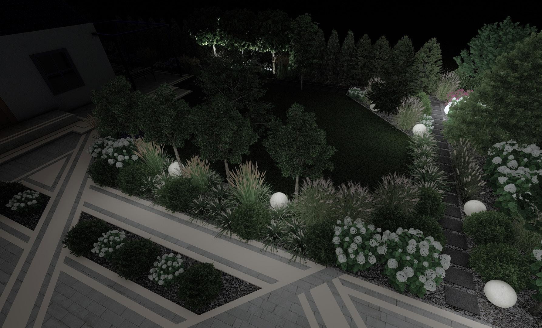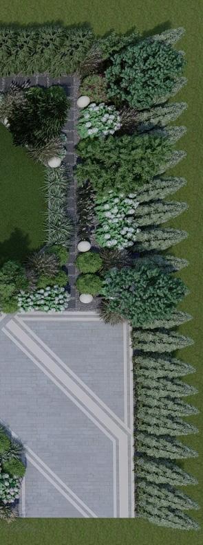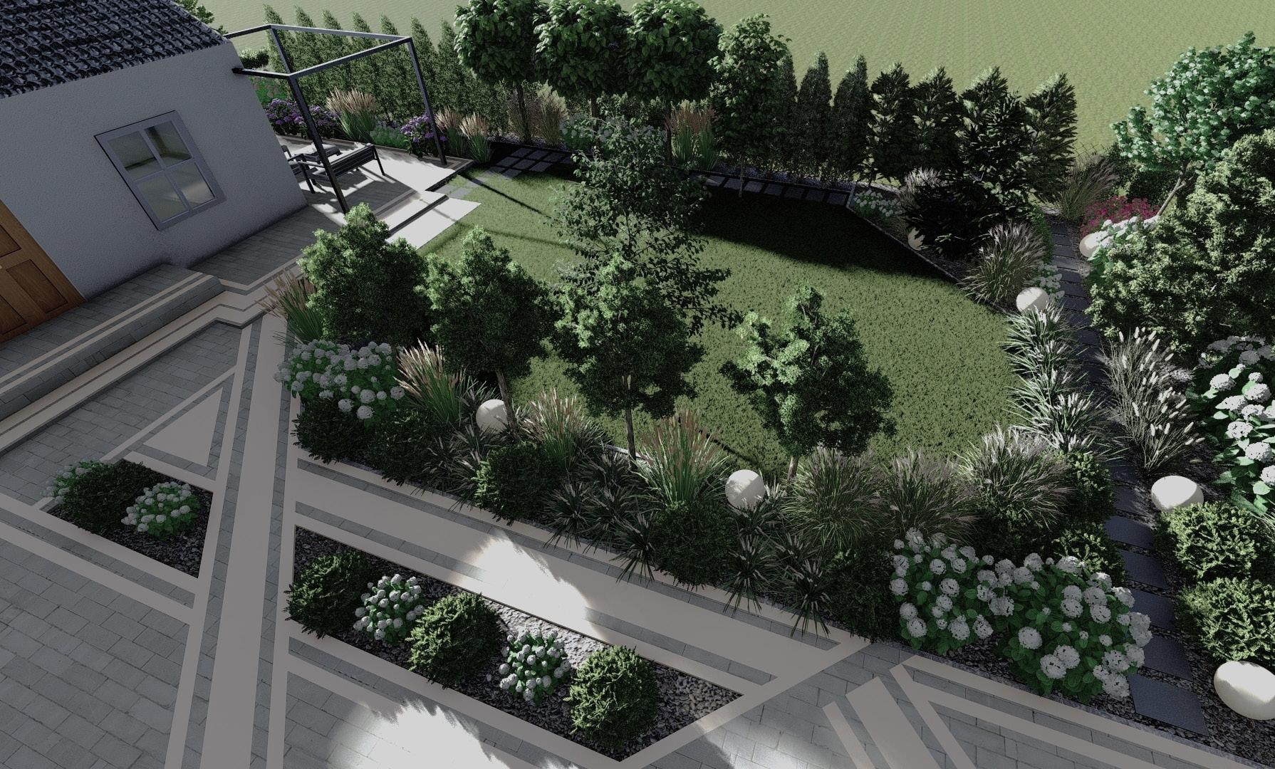 Projekt ogrodu zbudowany na geometrycznych kształtach nawierzchni kostki brukowej oraz betonowych dojść do altany. Dopełniony nasadzeniami zimozielonymi i w kolorach bieli.