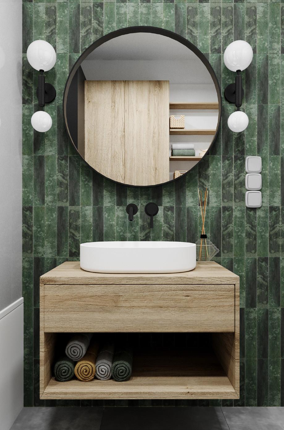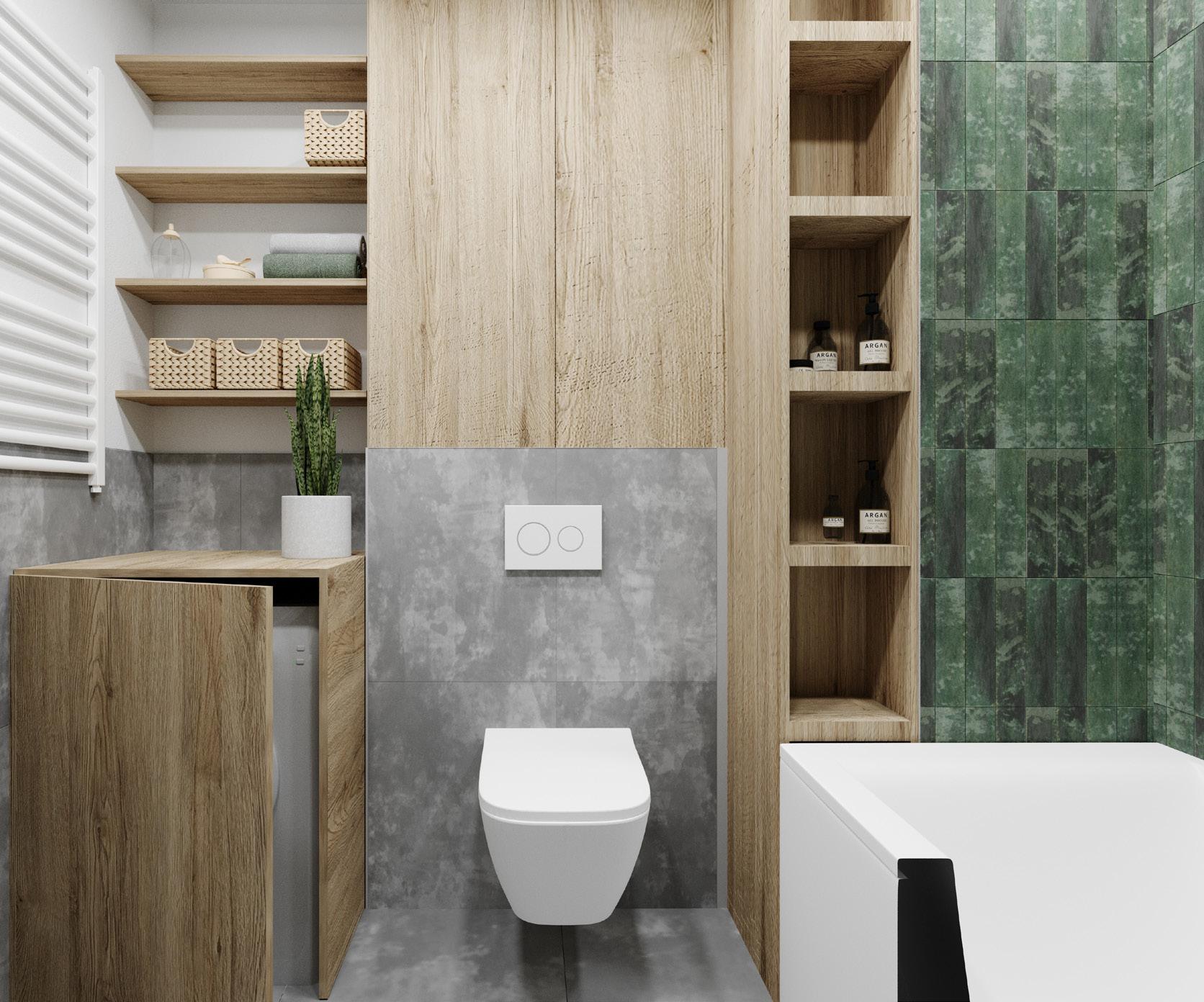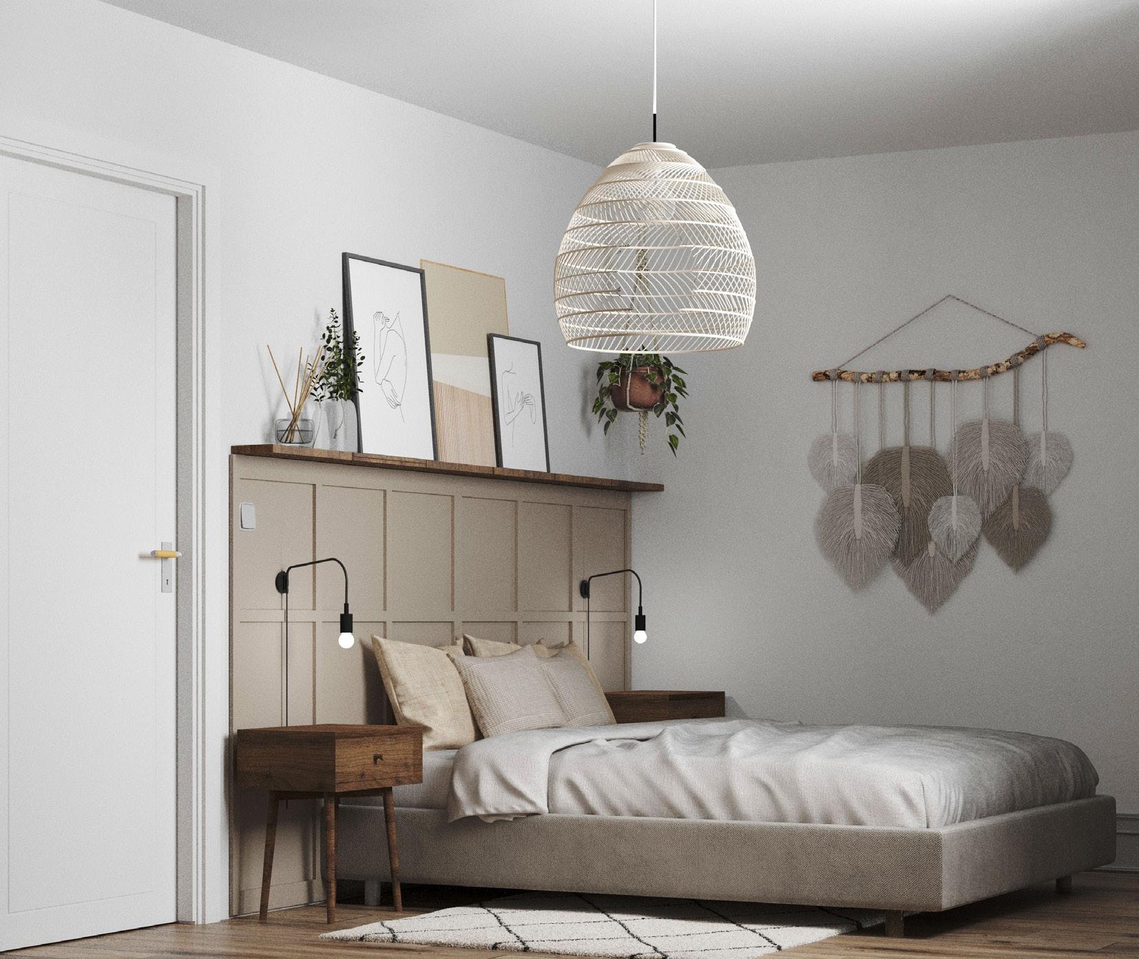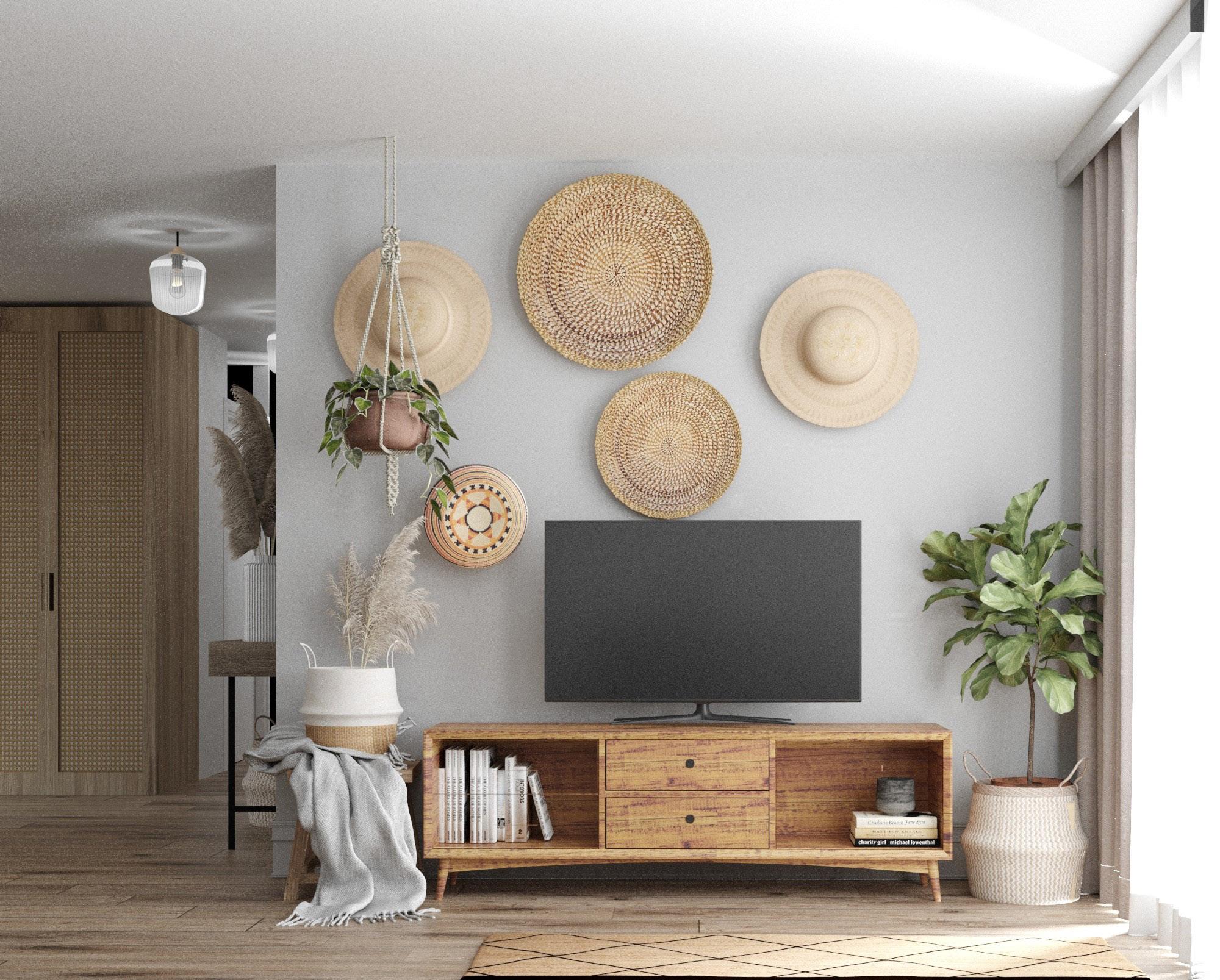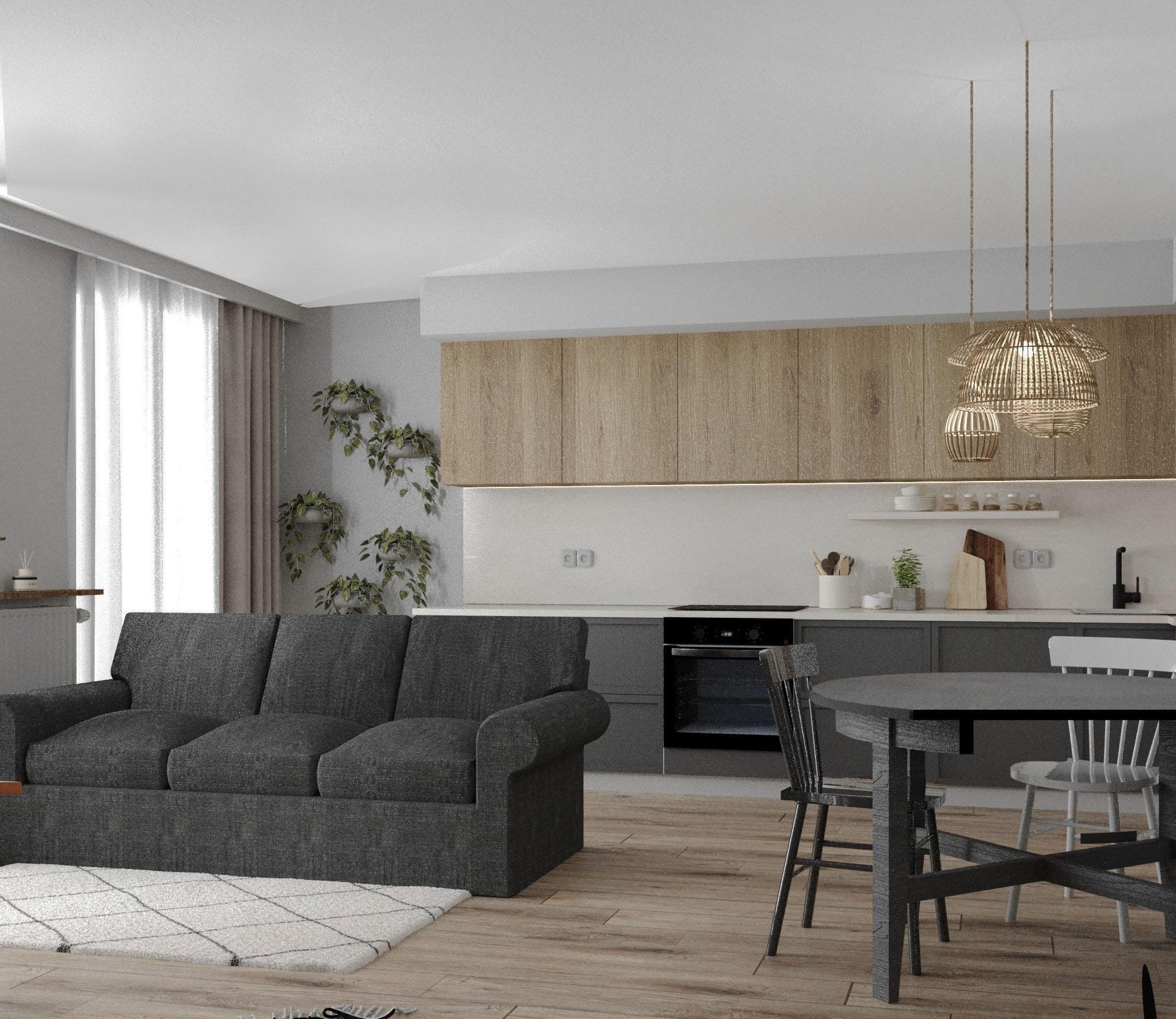 Wnętrze mieszkania zachowane w naturalnym stylu boho z drewnianymi zabudowami, elementami wiklinowmi i słomianymi. Przełamane nowoczesnymi formami wyposażenia i ozdobami.
