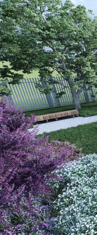 zimozielonych gatunkach oraz biało- fioletowych rabatach.