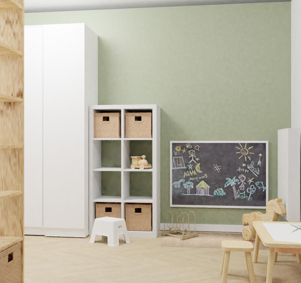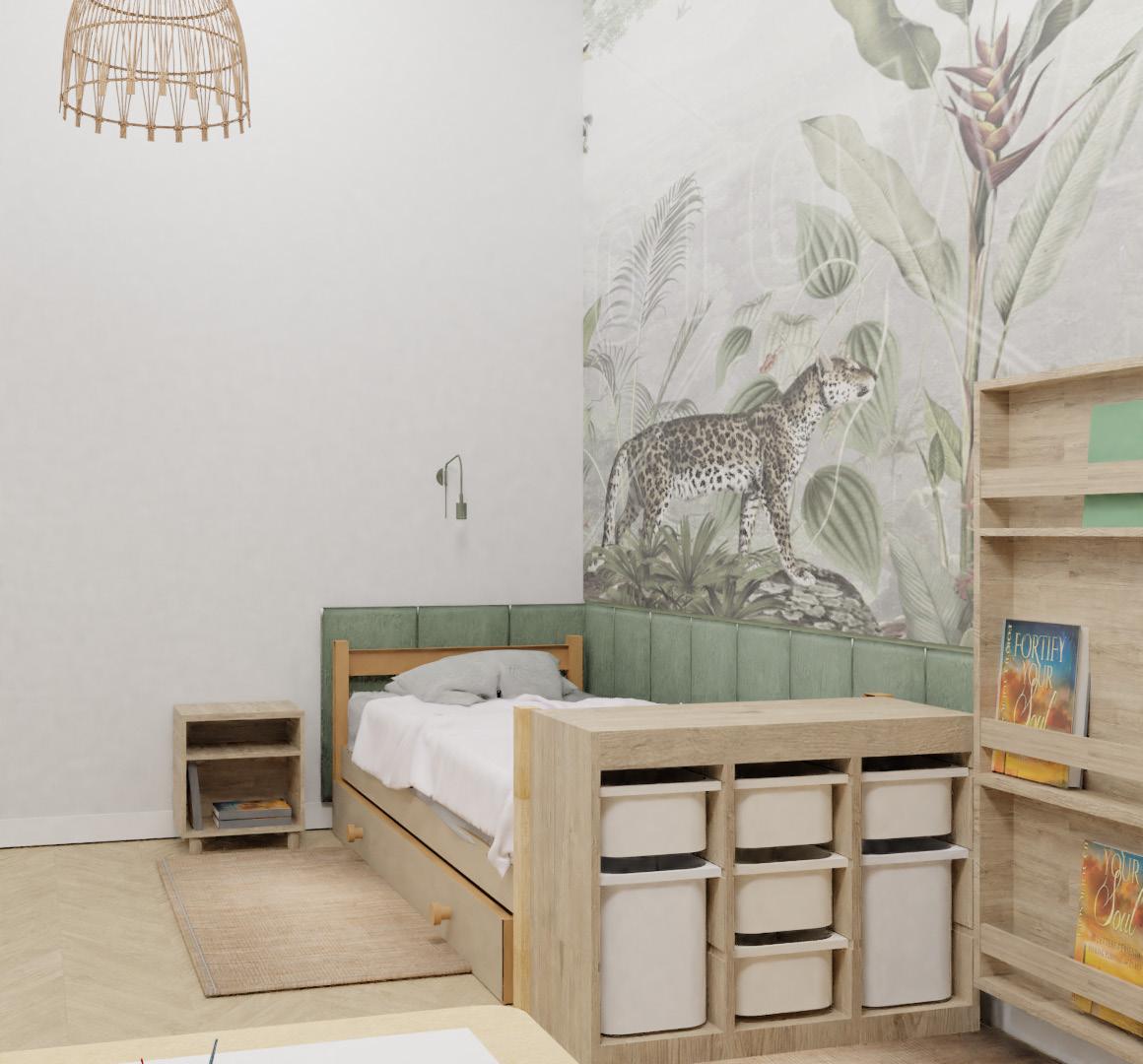 Wnętrze pokoju dla chłopca w stylu boho. Z naturalnych materiałów jak drewno, wiklina i słoma. Urozmaicony o zielone kolory paneli tapicerowanych przy łóżku i fo-