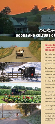 kind, are world famous for their wonderful patterns. With a wealth of craftsmen, our region is also a great place to find art pieces and wood furniture. From the store-lined streets of Berlin to the eclectic shops of Millersburg and Winesburg to the handmade items found in towns throughout the county, you can expect a memorable shopping experience in Holmes County. It is quite safe to say the Amish would feel a keen disappointment if visitors leaving Holmes County would remember them only for their thrifty farms, quilts and crafts. Instead they would desire a deeper understanding of their Christian beliefs, which is silently portrayed by their simple lifestyle. Charming bed and breakfasts, friendly people and scenic drives throughout – the comfortable pace in Holmes County is reason enough to visit and stay awhile. All photos used on the cover and this page were submitted to our Photo Contest. See page 11 for details. Cover: Top to bottom: James Williamson, OH; Stephen Costlow, IN; Denice Hazlett, OH; Ron Lawler, WV 2