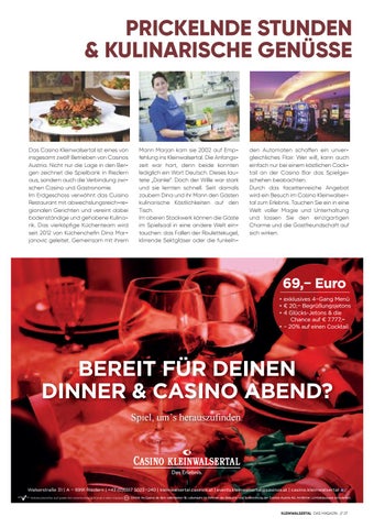 Das Casino Kleinwalsertal ist eines von insgesamt zwĂślf Betrieben von Casinos Austria. Nicht nur die Lage in den Bergen zeichnet die Spielbank in Riezlern aus, sondern auch die Verbindung zwischen Casino und Gastronomie. Im Erdgeschoss verwĂśhnt das Cuisino Restaurant mit abwechslungsreich-regionalen Gerichten und vereint dabei bodenständige und gehobene Kulinarik. Das vierkĂśpďŹ ge KuĚˆchenteam wird seit 2012 von KuĚˆchencheďŹ n Dina Marjanovic geleitet. Gemeinsam mit ihrem