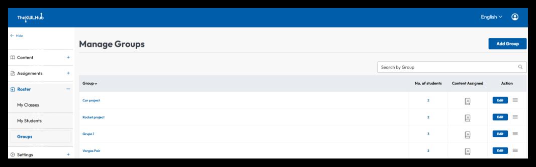 Groups are selections of students, not necessarily from the same class, that you can notify and assign content to as a unit. To access your groups, navigate to “Roster” and click on “Groups.”