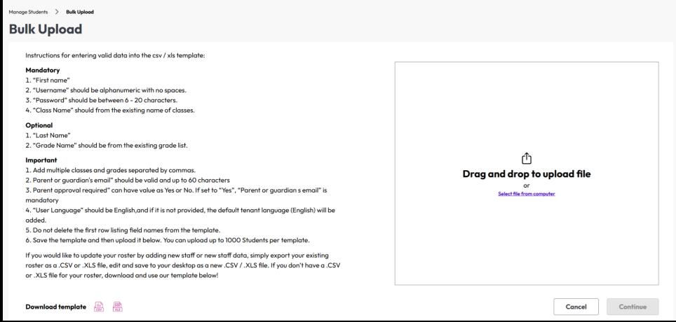 The two buttons at the top are used to add new students. If you select “Bulk Upload,” you will be able to quickly add multiple students to the platform. The steps are explained on the page, and a template is provided to help minimize errors.
