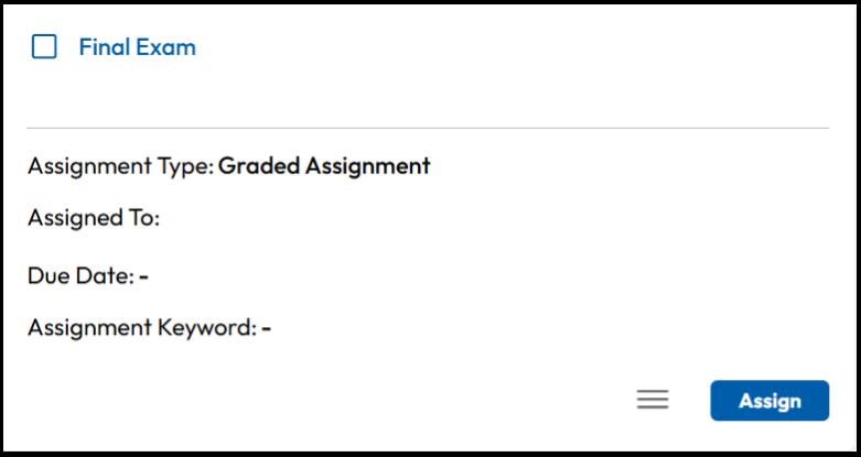 On an assignment card, you can find all relevant information, such as the assignment type, the students it is assigned to, the selected due date, and more. You can also access the assignment options, as well as the “Assign” button.