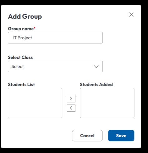 To create a new group, click the “Add Group” button. A prompt will appear asking for a name and the students you want to add to the group. Once you have added all the students, click “Save” to create the group.