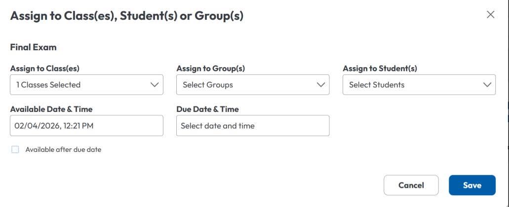 A pop-up will appear showing to whom the assignment will be assigned, the available and due dates, and the option to allow submission after the due date. Once you are satisfied with these settings, click “Save” to complete the process.