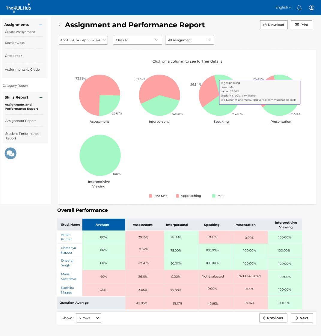 Here you can see a summary of the skills being tracked, each accompanied by a pie chart showing what percentage of students have met the criteria set for that skill. You can make this search more precise by specifying a certain timeframe, class, or assignment. Below the pie charts, you will find a summary table that connects students with their performance in each area.