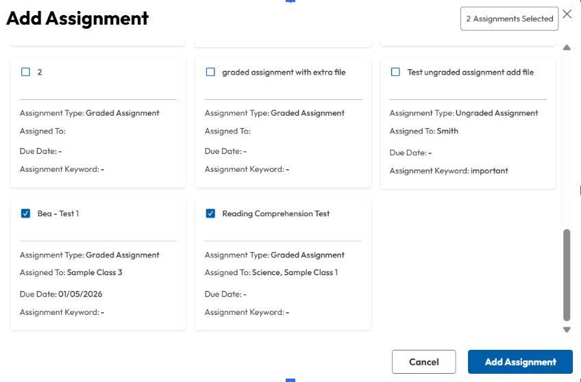 To add an assignment to a folder, click the “Add Assignment” button to the right of the folder where you want to place it. When you click, a pop-up will appear showing all assignments available on the platform. Select the assignments you wish to add, and then click the “Add Assignment” button at the bottom.
